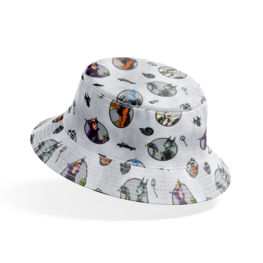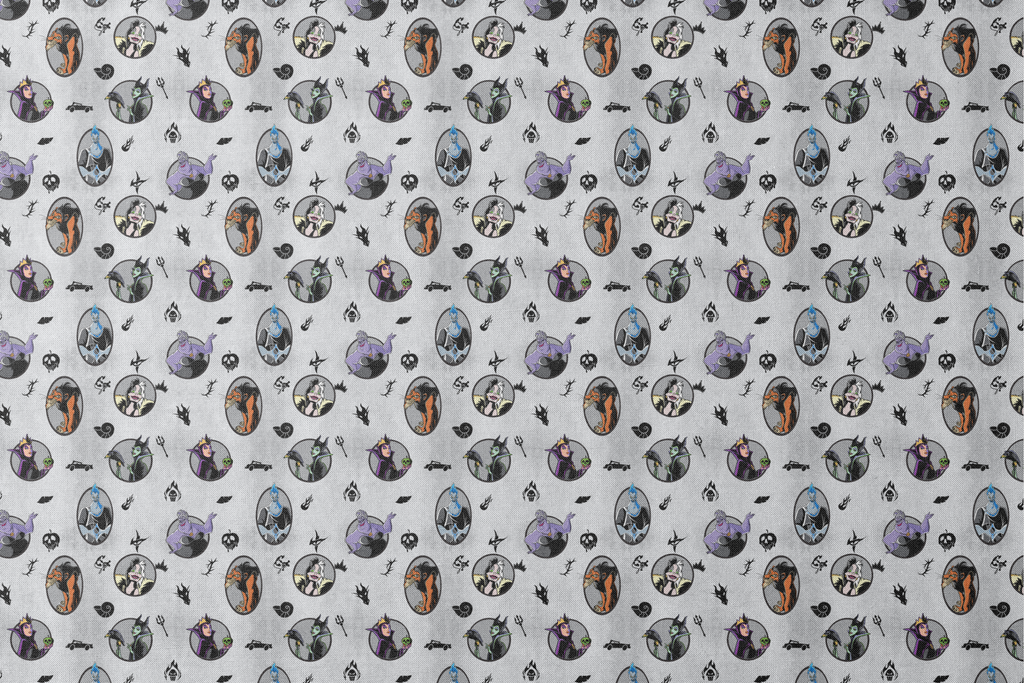 Spooky Disney villains pattern in circles on a gray background with Halloween-inspired motifs like skulls, potions, and flames scattered throughout.