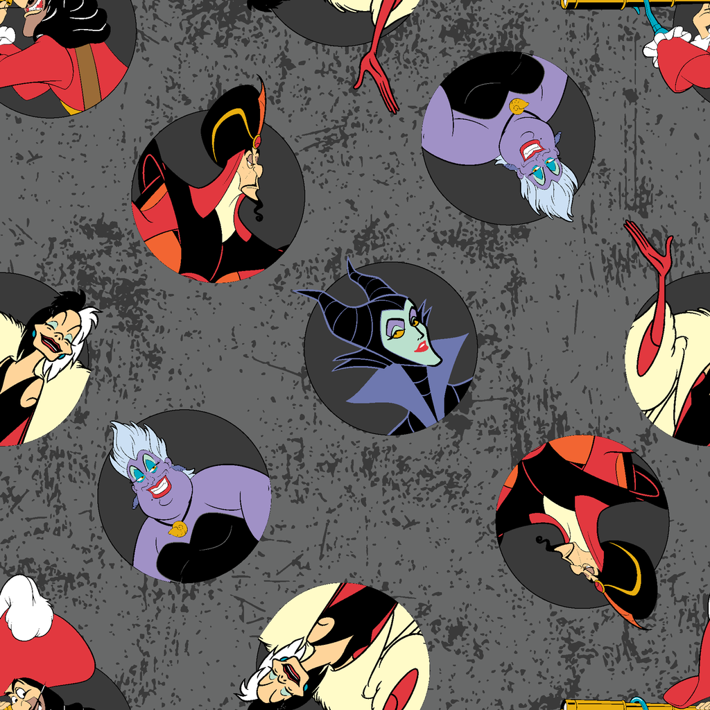 Disney Villains Badges Scatter on Gray Fabric