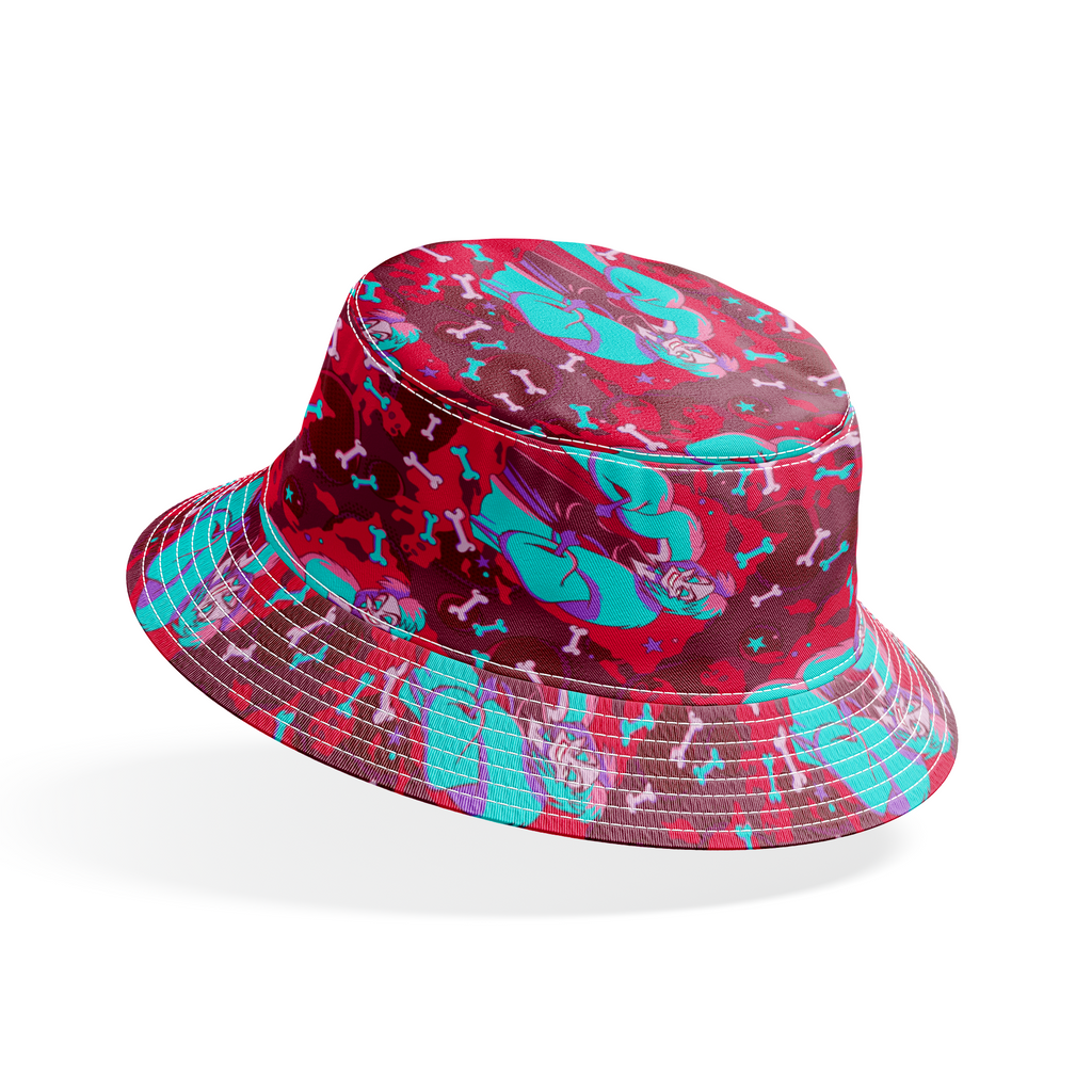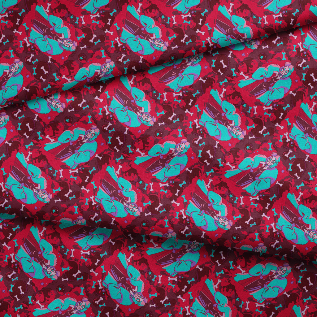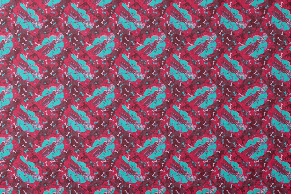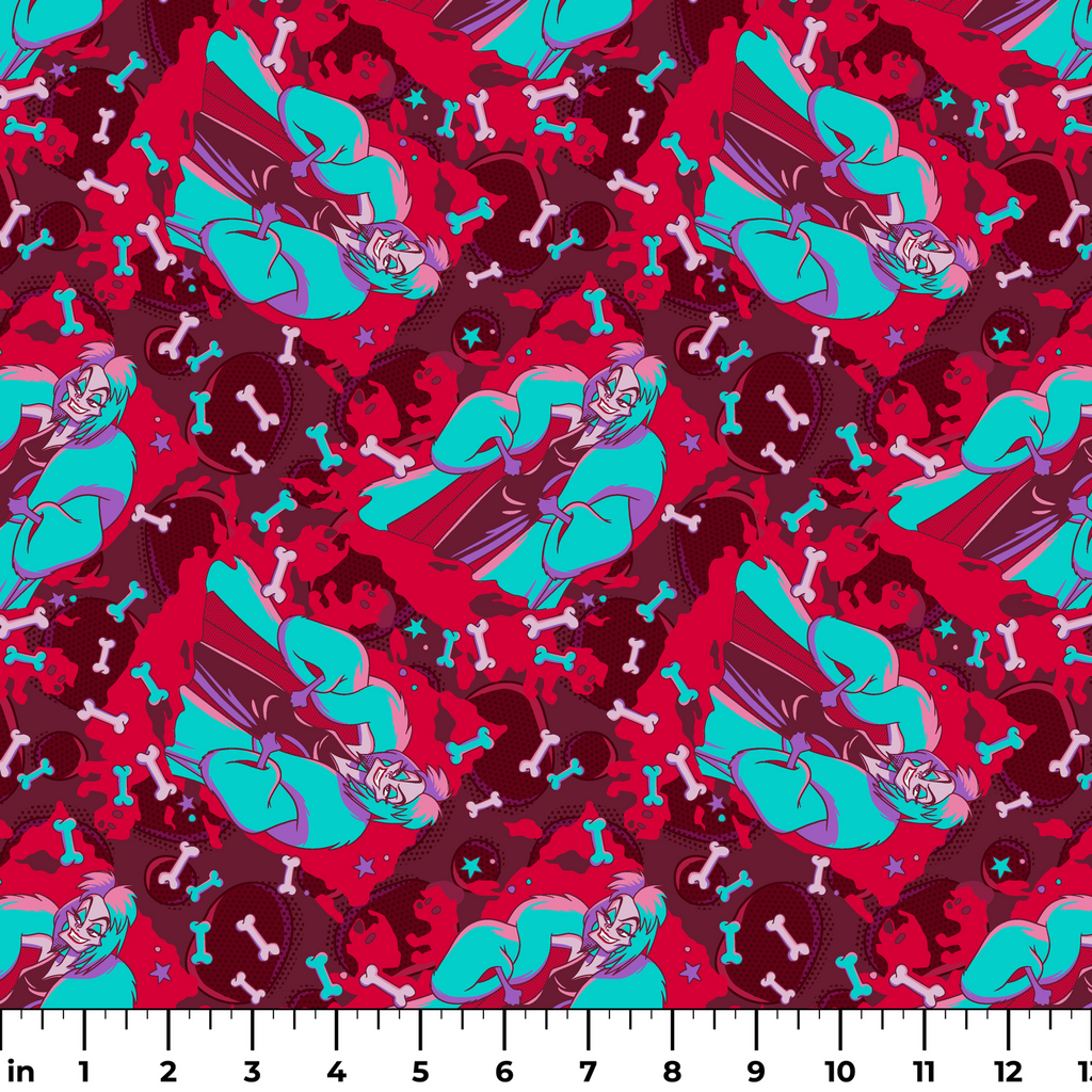 This vibrant pattern features Disney Villains Cruella in teal against a bold pink background with white bone motifs, perfect for fans of One Hundred and One Dalmatians and quirky character designs.