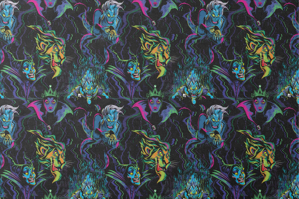 Vibrant neon Disney villains pattern featuring iconic characters in psychedelic colors on a black background. This bold, contemporary Disney design showcases menacing faces with an edgy, modern aesthetic.