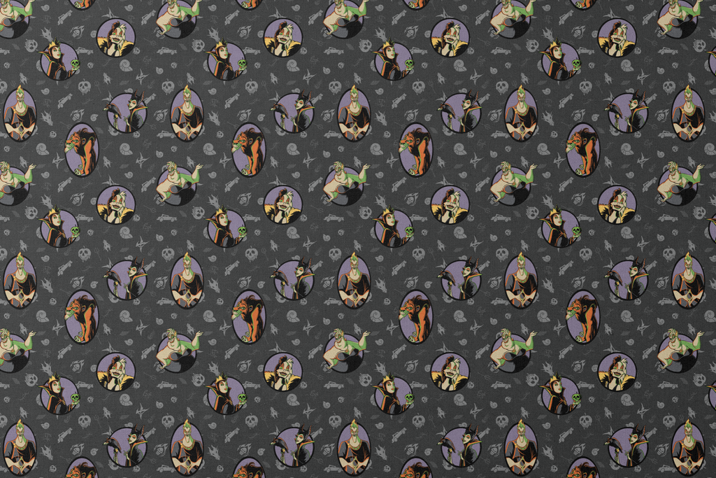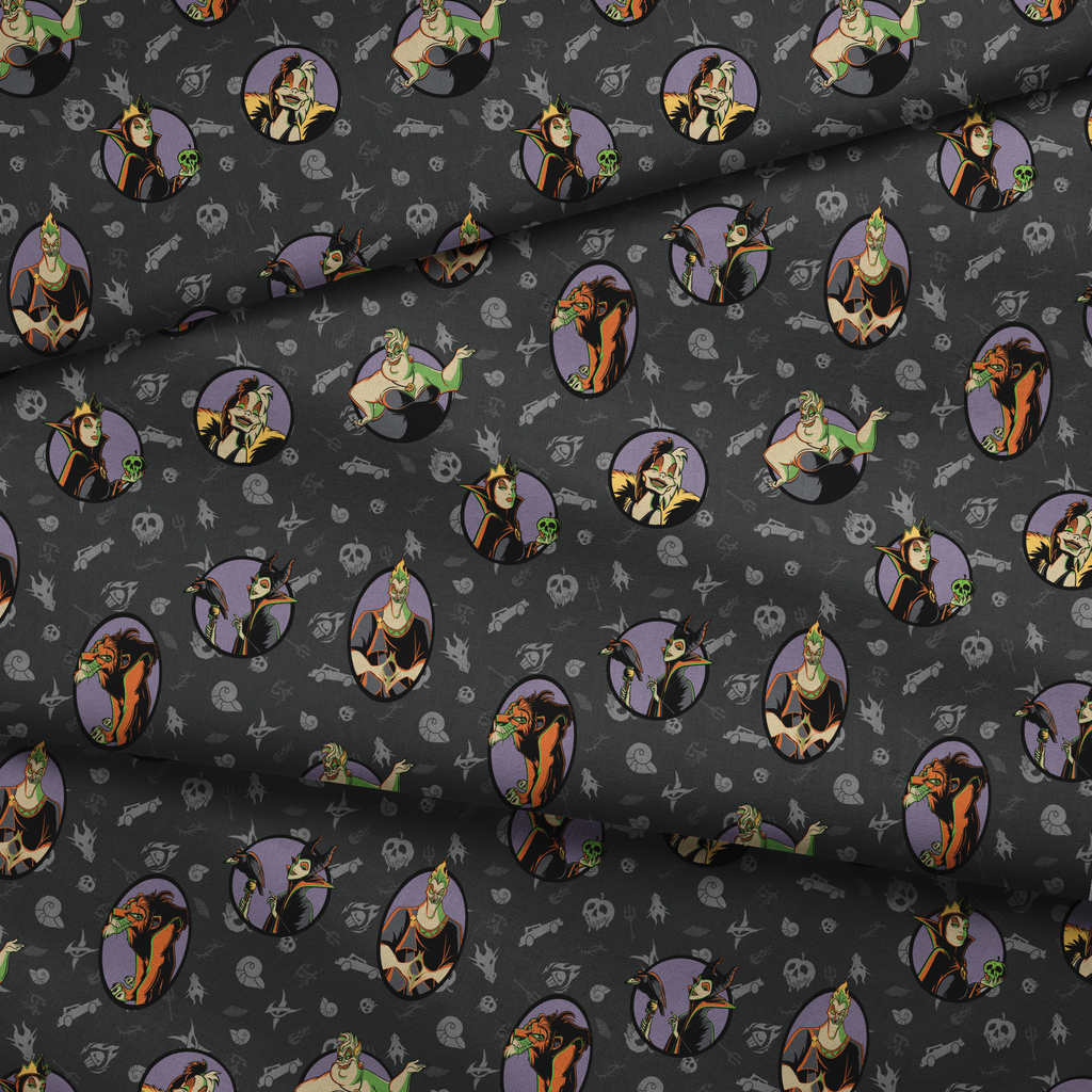 This Disney Villains pattern features iconic characters in dramatic purple frames on a gothic black background with skulls and evil symbols for a wickedly stylish look.