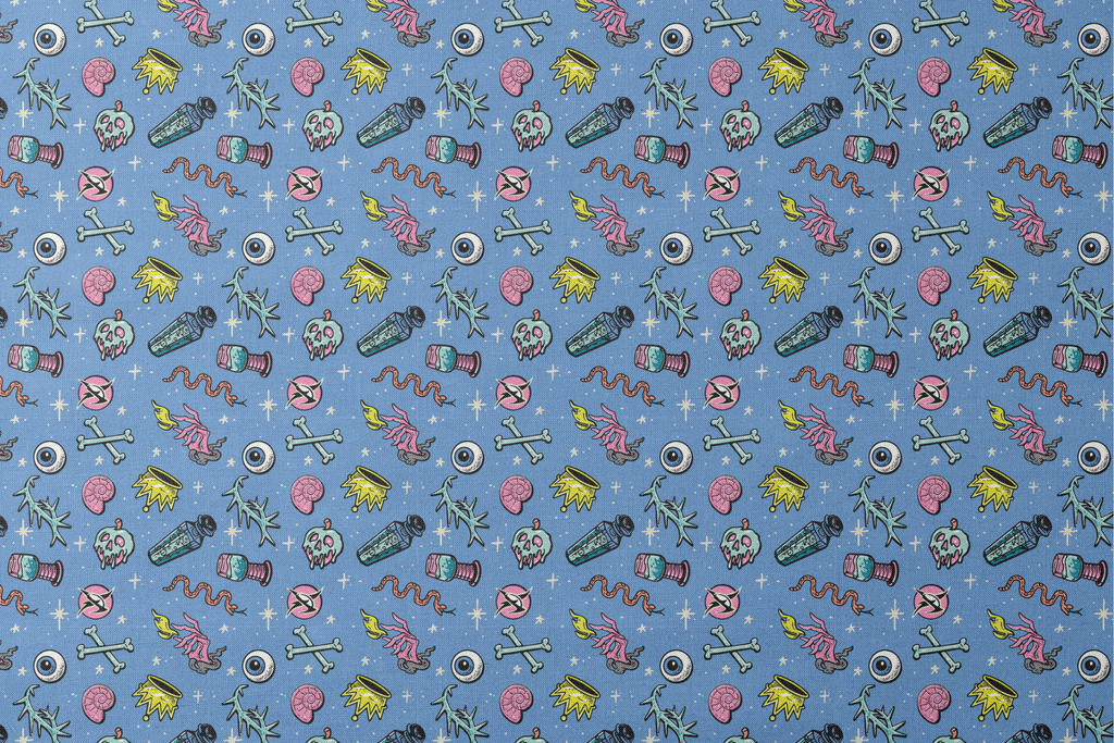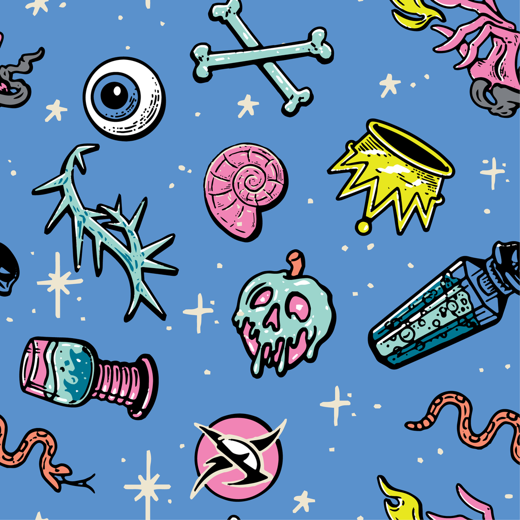 Disney Villains Icons featuring spooky motifs with bones, skulls, eyeballs, and potion bottles on a starry blue background - perfect for gothic Halloween apparel or accessories.