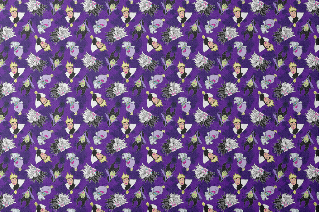 Vibrant purple cotton featuring iconic Disney villains in a seamless pattern. Perfect for fans of classic animation with its bold character designs and dramatic color palette.
