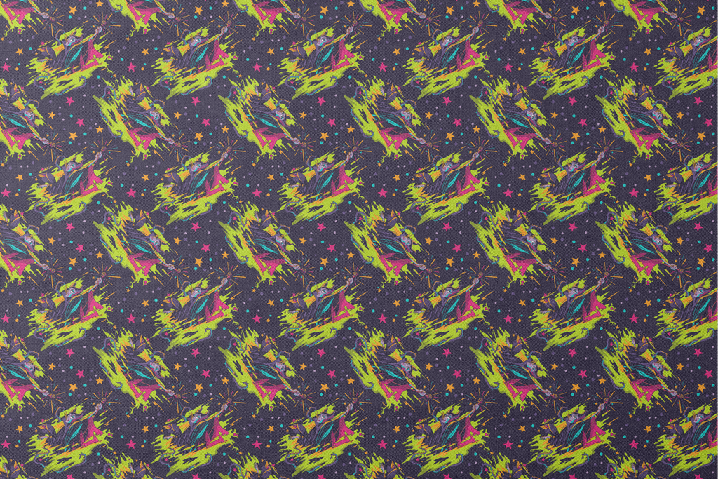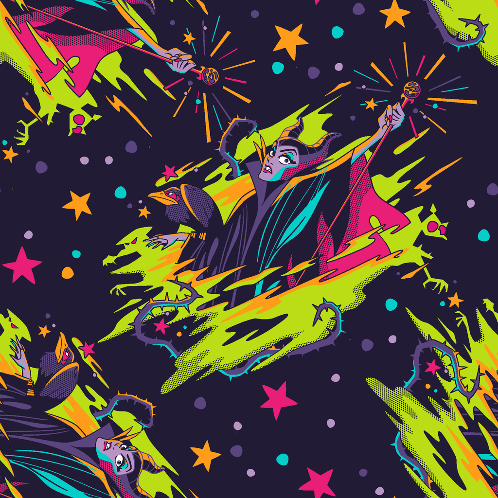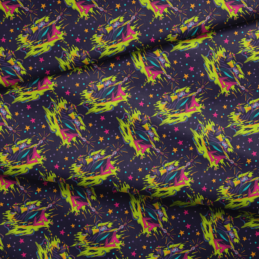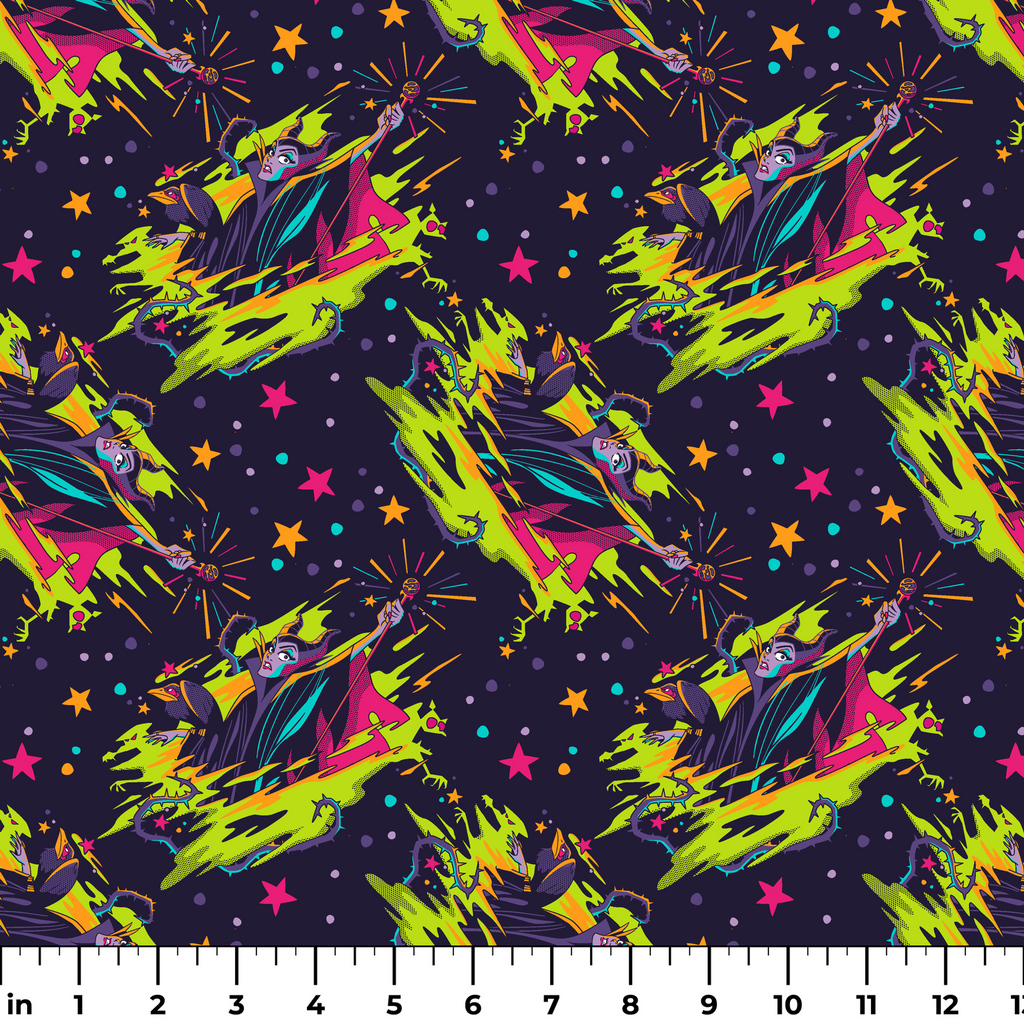 Vibrant Disney Villains Maleficent neon splashes and colorful stars create a dynamic cosmic pattern in fluorescent yellow, pink and purple against a deep navy background. Perfect for bold, retro-inspired fashion or home decor.