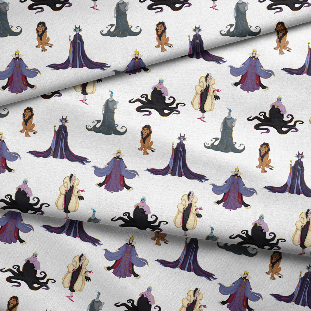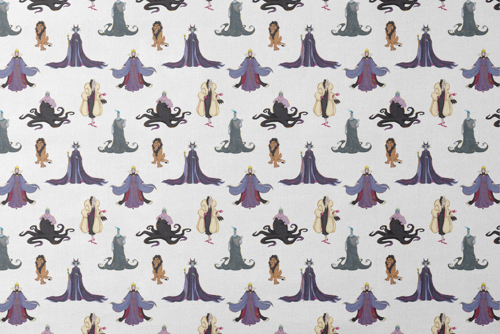 Timeless pattern featuring classic Disney villains in elegant poses. Captures iconic characters with their signature colors and styles against a clean white background.