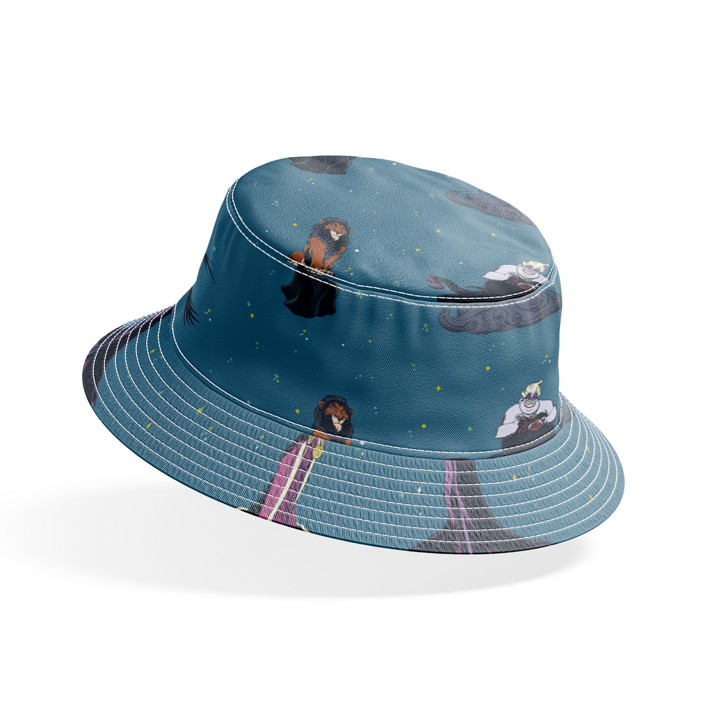 Enchanting Disney villains pattern featuring Ursula, Maleficent, and Scar on a teal background. Perfect for fans of classic animated antagonists, this design showcases the most iconic evil characters in whimsical, stylized illustrations.