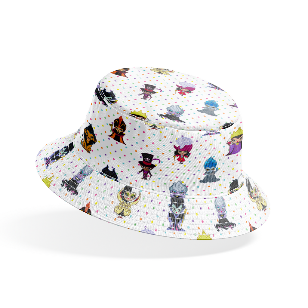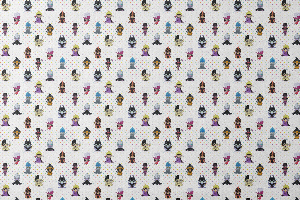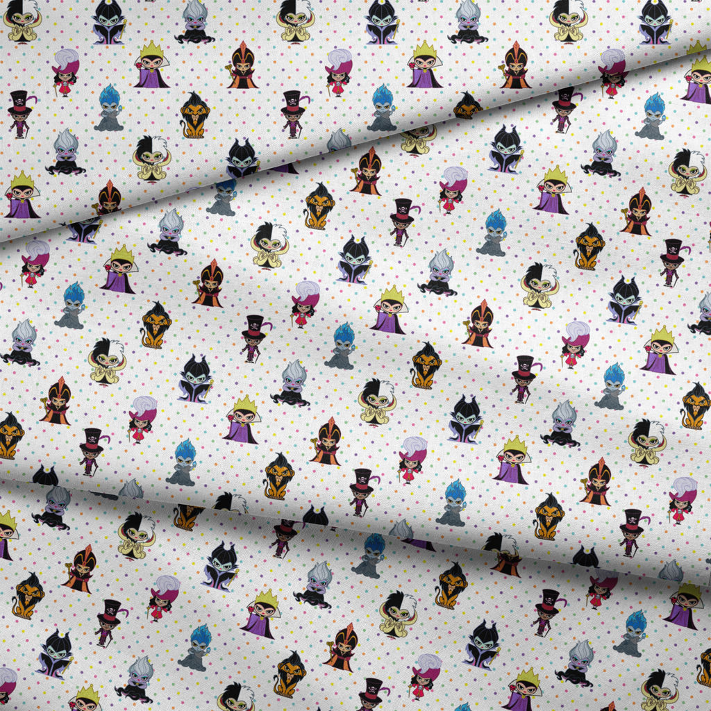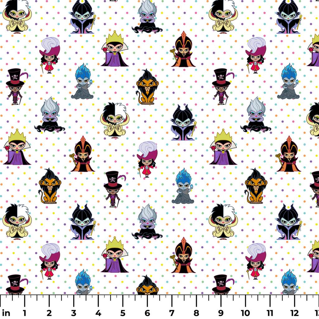 Adorable cartoon-style Disney villains pattern featuring colorful characters on a polka dot background. Perfect for fans of animated films who love whimsical, playful designs.