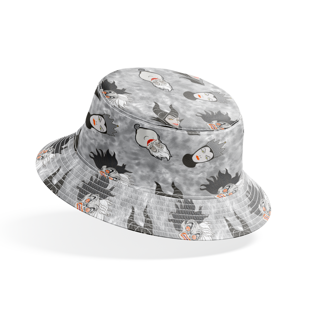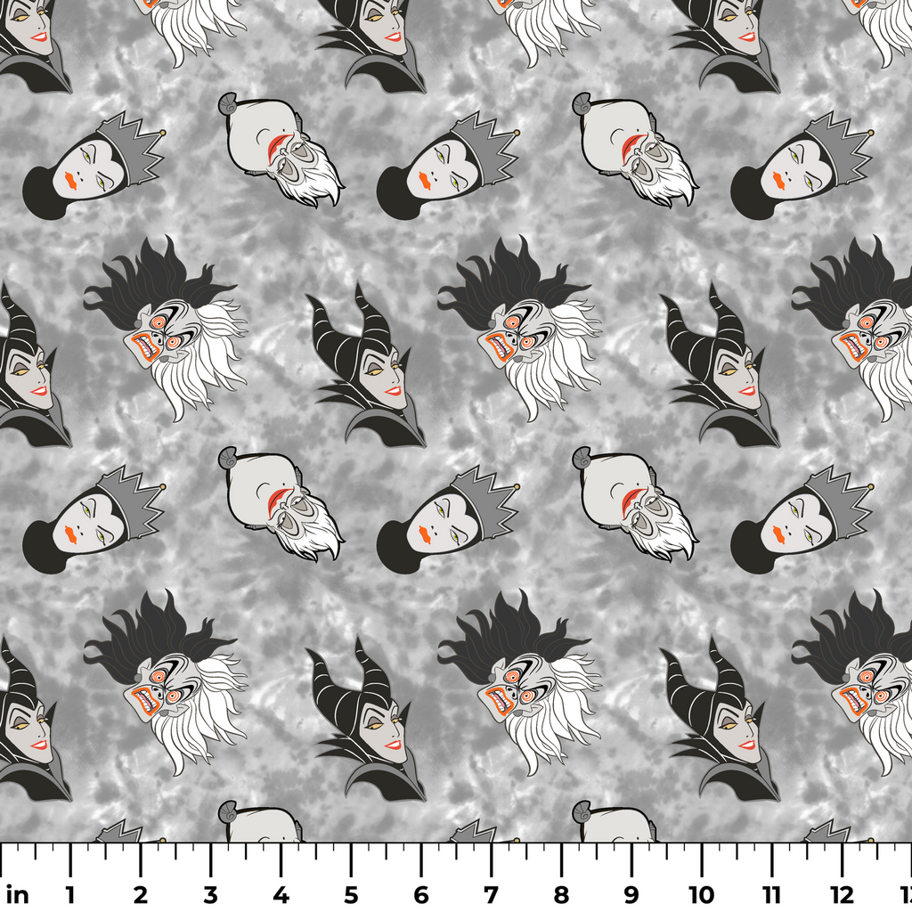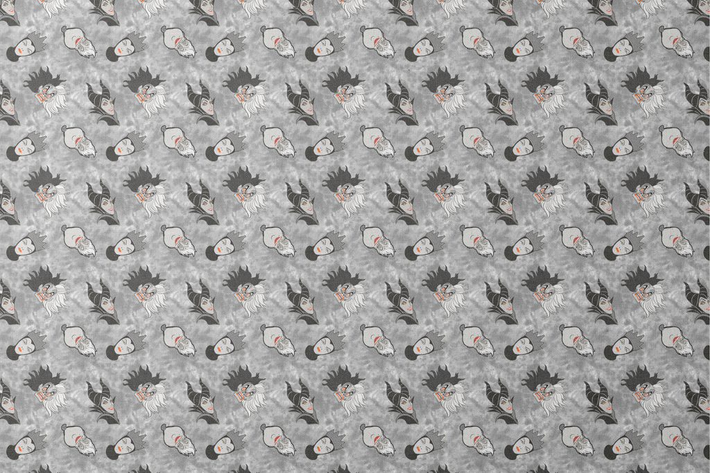 Wickedly stylish Disney villain print featuring iconic animated characters on a textured gray background - perfect for fans of classic animated movies.