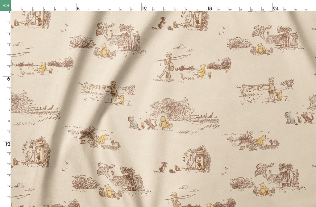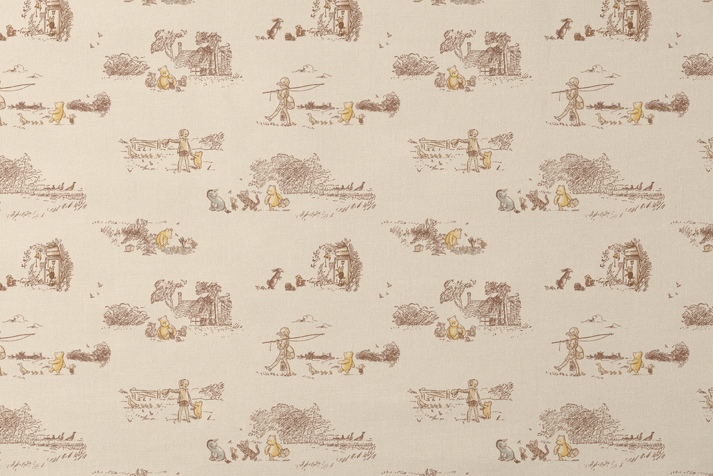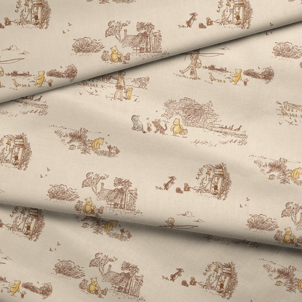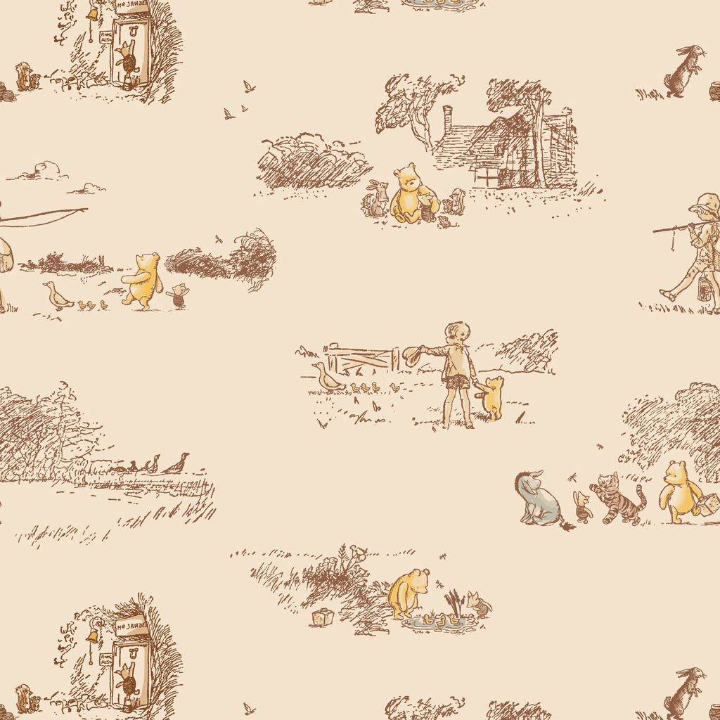 Classic Disney Winnie the Pooh toile pattern featuring cream and brown sketched scenes of beloved characters in timeless vintage style. Perfect for nursery decor.