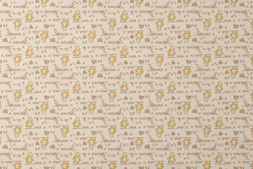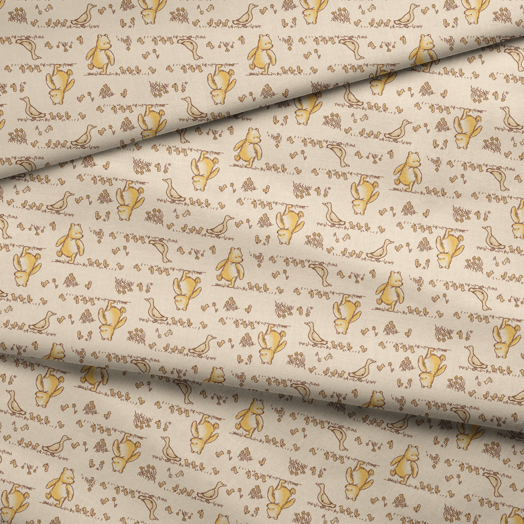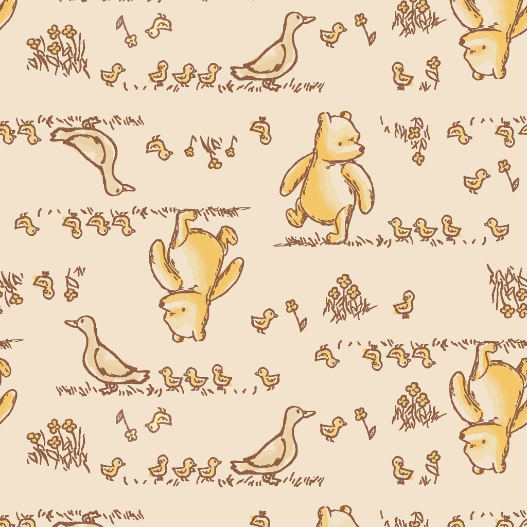 Adorable Disney Winnie the Pooh pattern in warm honey tones featuring classic characters, chicks, and whimsical flowers on a cream background. Perfect for classic Winnie the Pooh fans.