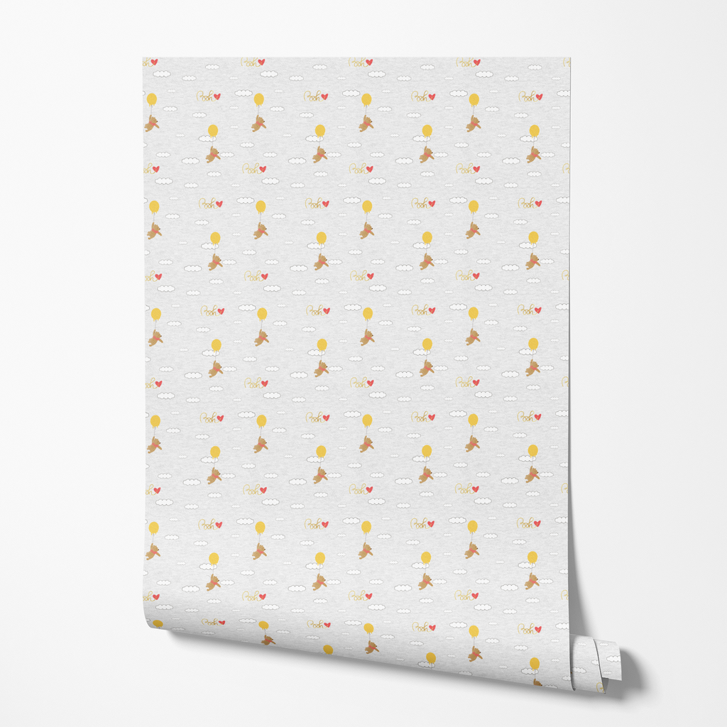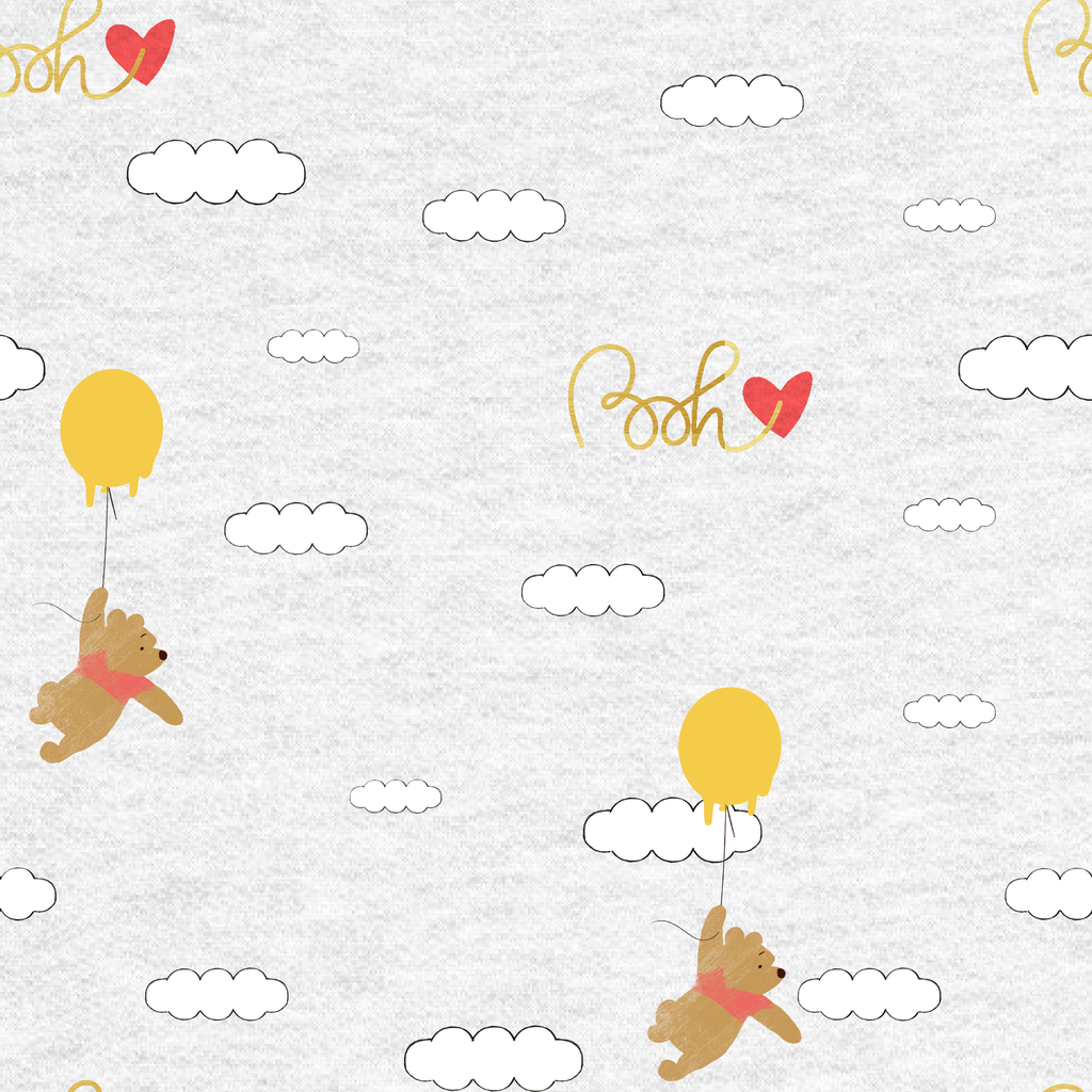 Adorable Disney Winnie the Pooh pattern featuring the beloved character floating with yellow balloons amid fluffy white clouds on a light gray background, perfect for nurseries.