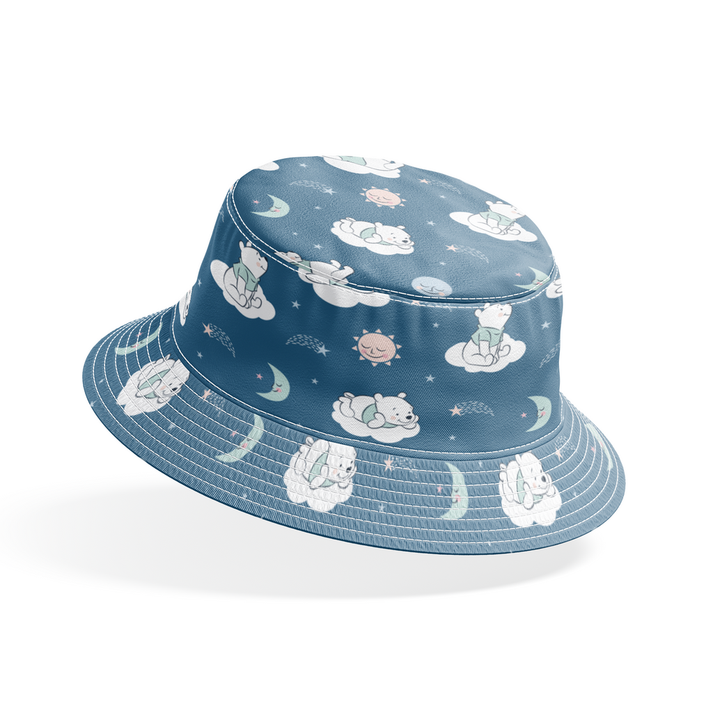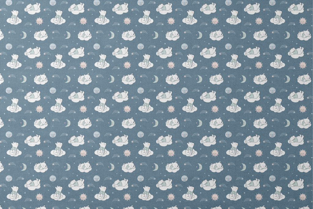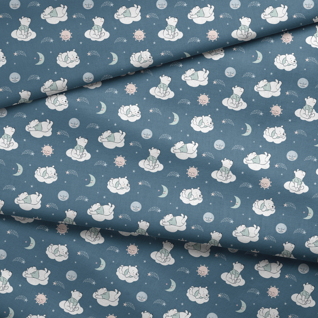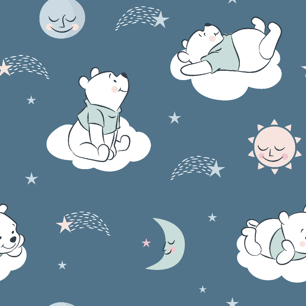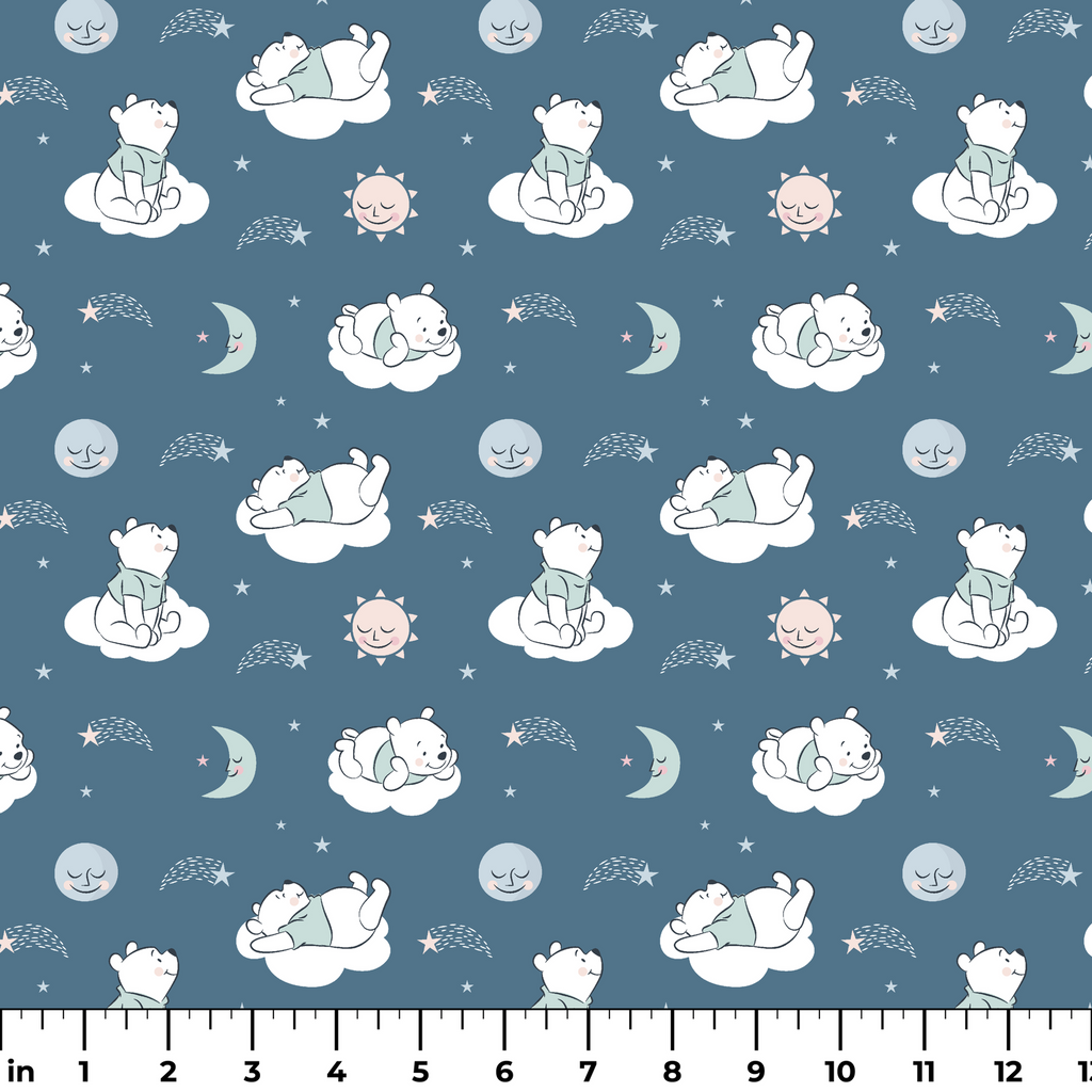 Sweet Disney Winnie the Pooh sleeping and relaxing on clouds with moons and stars on a blue-gray background - perfect for nursery decor or children's bedding.