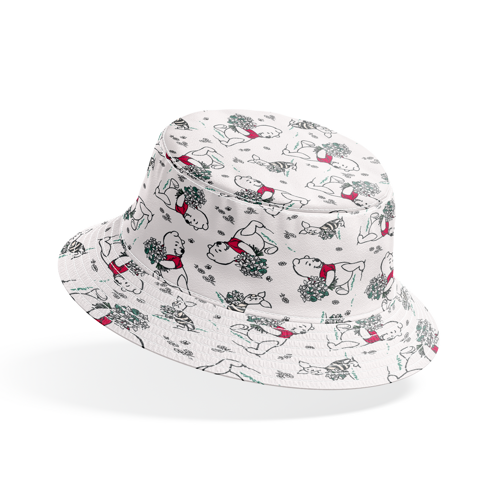Whimsical Disney Winnie the Pooh and Piglet toss with floral bouquets and scattered motifs on a white background in classic Disney style. Perfect for classic home decor.