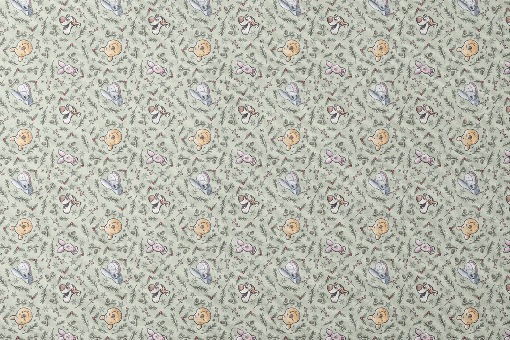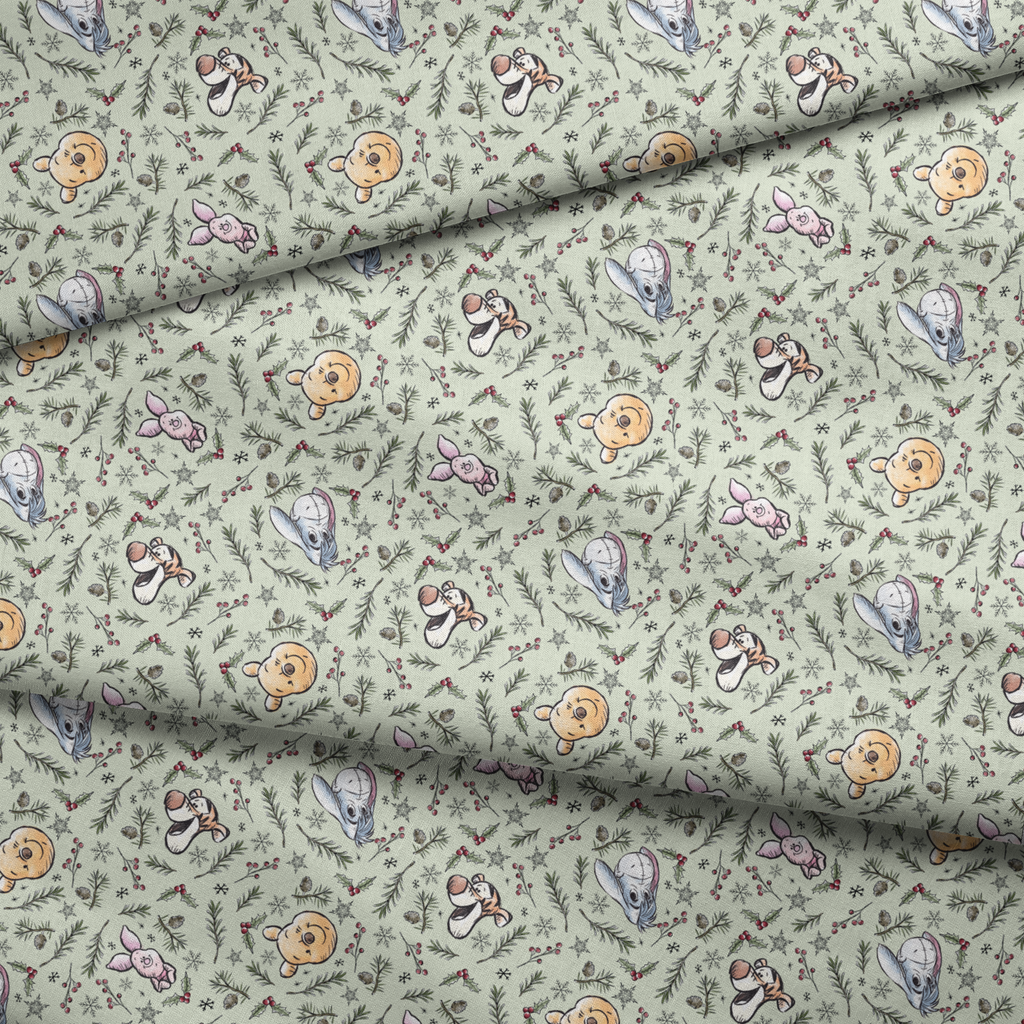 This whimsical winter fabric features beloved Disney's Winnie the Pooh character faces scattered among festive greenery on a soft mint background. Pooh, Piglet, Eeyore, and Tigger peek out between delicately illustrated pine branches, holly berries, pinecones, and snowflakes in a charming hand-drawn style. Perfect for holiday quilting projects or creating special Christmas stockings that will become family treasures for years to come. Based on the “Winnie the Pooh” works by A.A. Milne and E.H. Shepard. © Disney