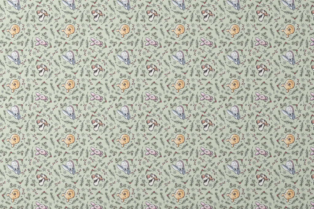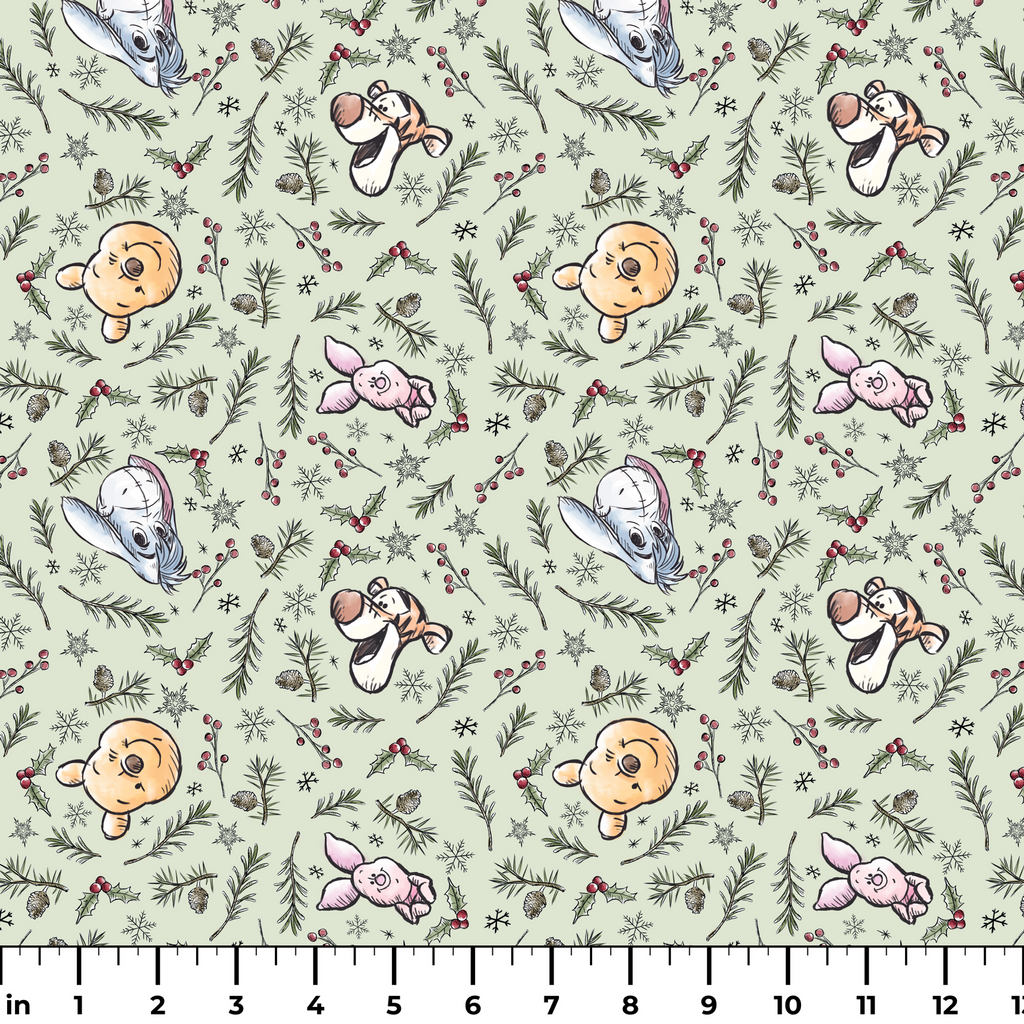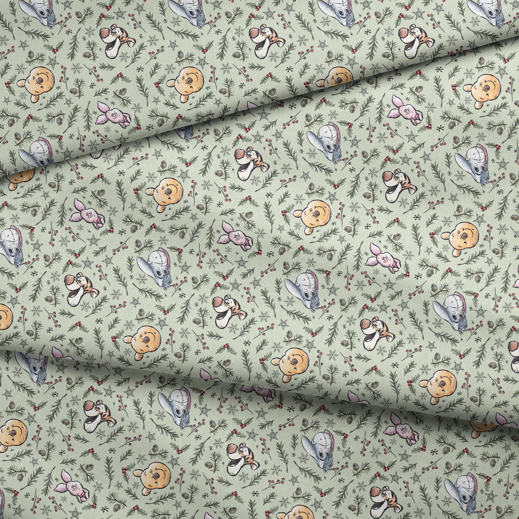 This whimsical winter fabric features beloved Disney's Winnie the Pooh characters scattered among festive greenery on a soft mint background. Pooh, Piglet, Eeyore, and Tigger peek out between delicately illustrated pine branches, holly berries, pinecones, and snowflakes in a charming hand-drawn style. Perfect for holiday quilting projects or creating special Christmas stockings that will become family treasures for years to come.