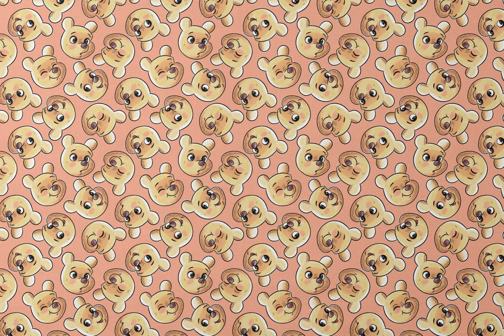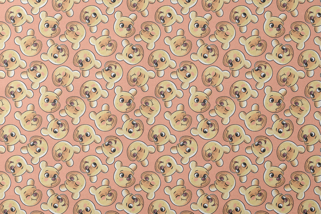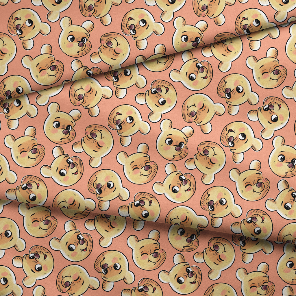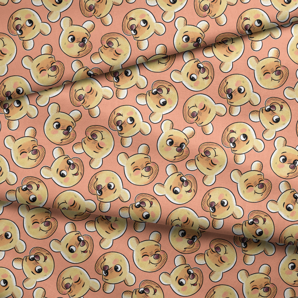 Adorable cartoon Disney's Winnie the Pooh faces scatter across a warm peach background in this charming fabric. Each honey-colored bear features expressive eyes, cute rosy cheeks, and a variety of playful expressions that capture the beloved character's sweet personality. Perfect for nursery projects, this whimsical pattern would make delightful crib sheets, stuffed animals, or a cozy blanket for little ones who love this classic character.