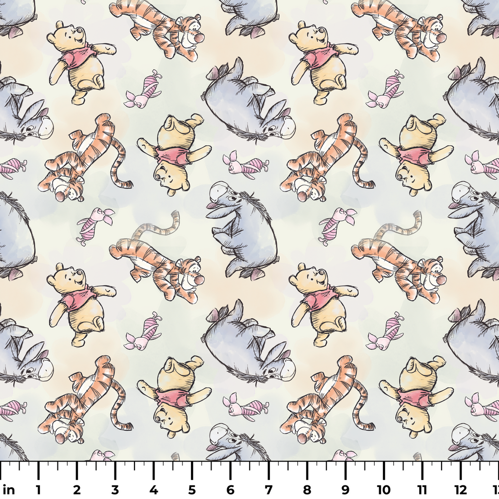 Adorable classic storybook pattern featuring Winnie the Pooh, Tigger, Piglet, and Eeyore on a soft cream background. Perfect for nurseries and children's rooms.