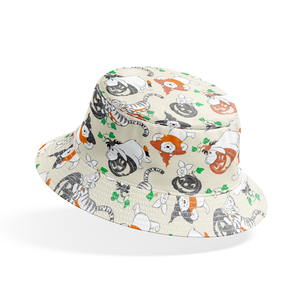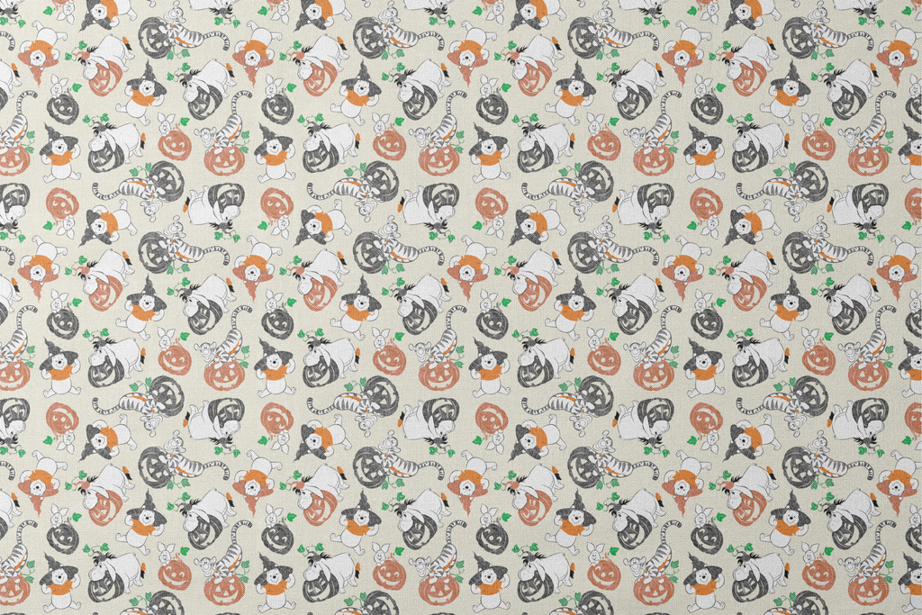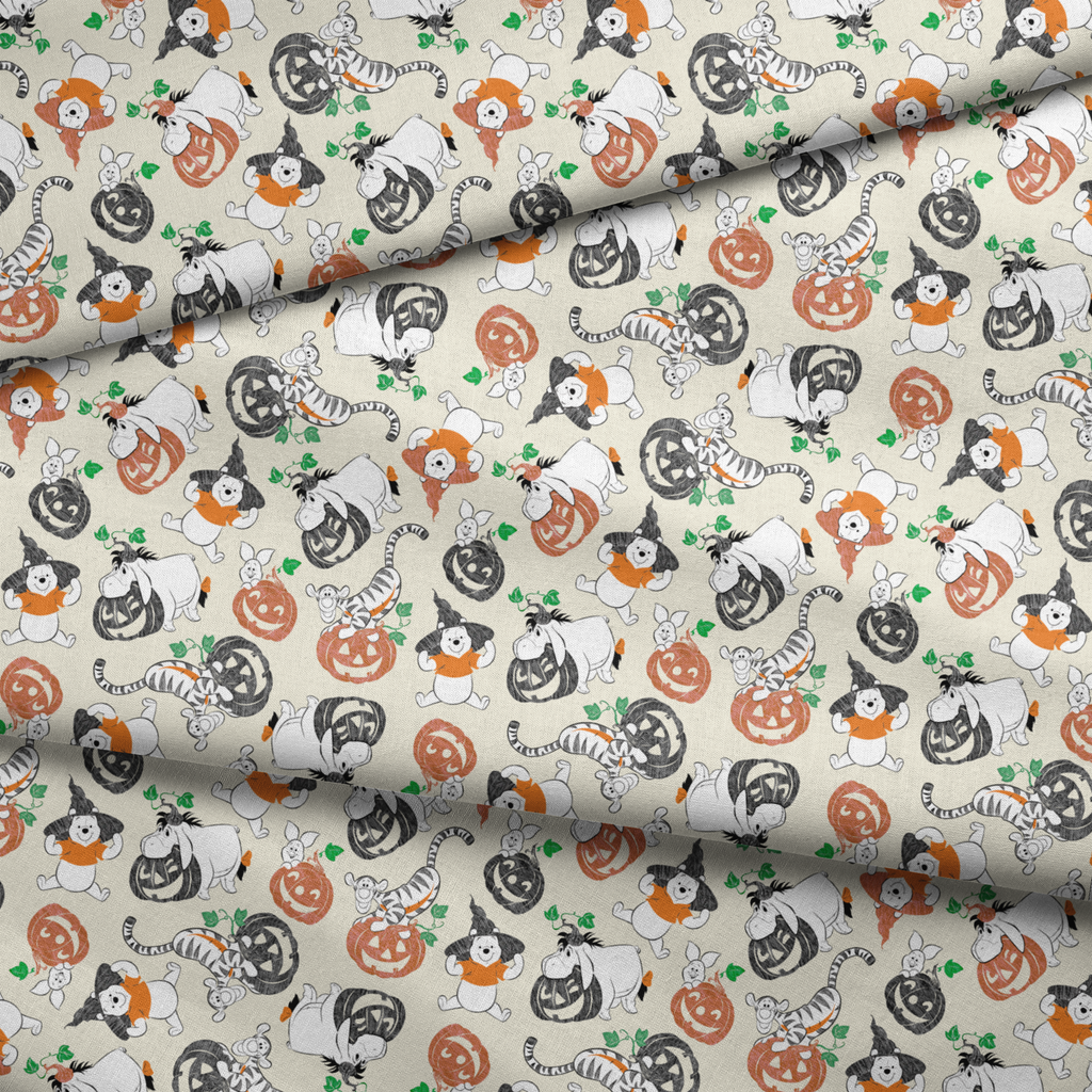 Delight in this whimsical Disney's Winnie the Pooh Halloween fabric featuring beloved characters from the Hundred Acre Wood in sketch-like illustrations on a cream background. Pooh sports an adorable witch hat with orange shirt, while Eeyore, Tigger, and Rabbit frolic among carved pumpkins in orange and black, accented with green ivy leaves. Perfect for creating festive pillows, treat bags, or a child's Halloween costume that combines classic characters with just the right touch of spooky fun.