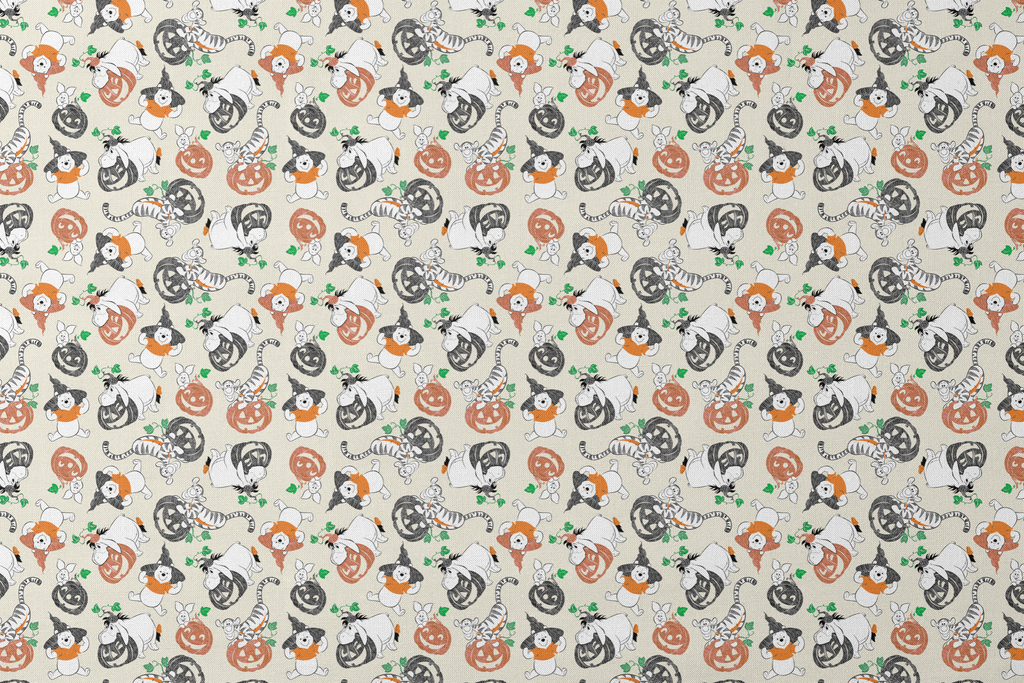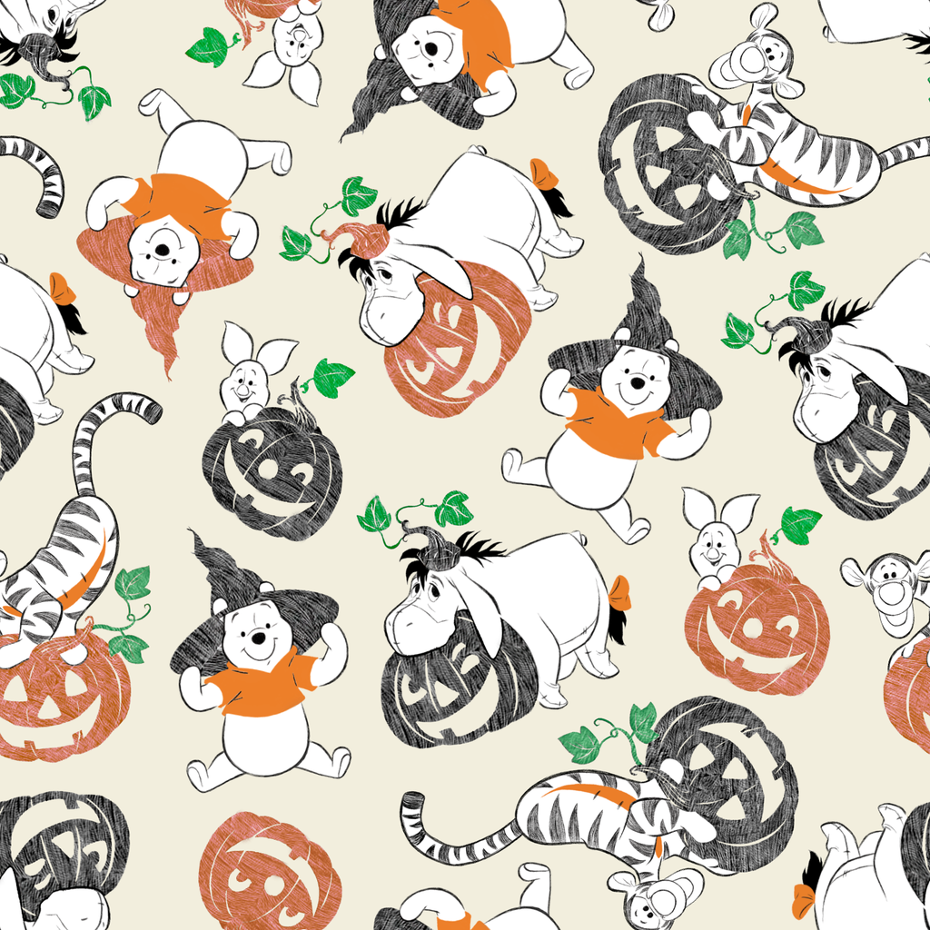 Delight in this whimsical Disney's Winnie the Pooh Halloween fabric featuring beloved characters from the Hundred Acre Wood in sketch-like illustrations on a cream background. Pooh sports an adorable witch hat with orange shirt, while Eeyore, Tigger, and Rabbit frolic among carved pumpkins in orange and black, accented with green ivy leaves. Perfect for creating festive pillows, treat bags, or a child's Halloween costume that combines classic characters with just the right touch of spooky fun