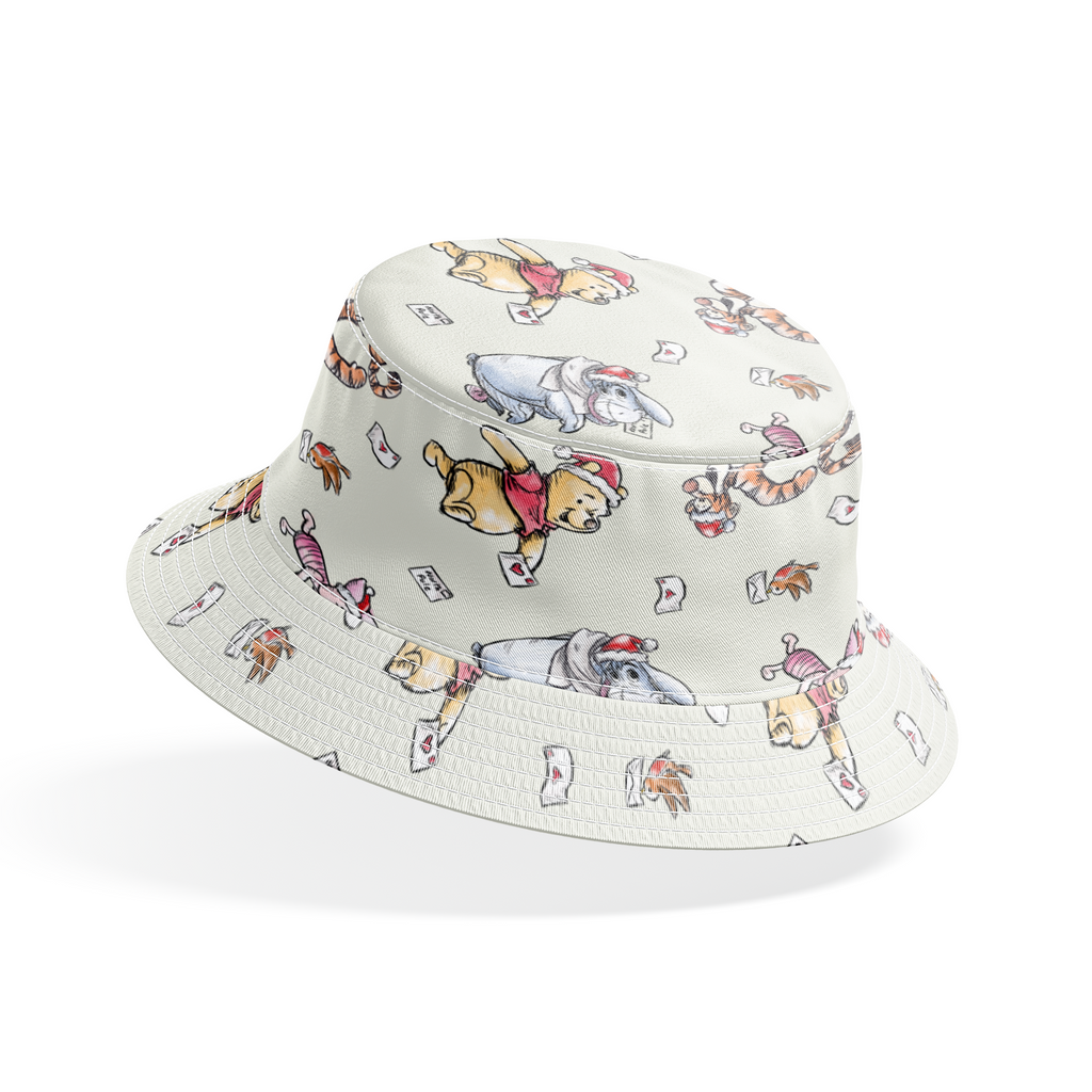 Whimsical watercolor illustrations of Disney's Winnie the Pooh and friends decorate this heartwarming fabric, featuring the beloved characters dressed in festive Santa hats with tiny envelopes containing loving messages scattered throughout. The classic characters are rendered in soft honey tones, muted grays, and touches of holiday red against a crisp white background, creating a nostalgic yet fresh design. Perfect for holiday quilting projects that will become a family keepsake.