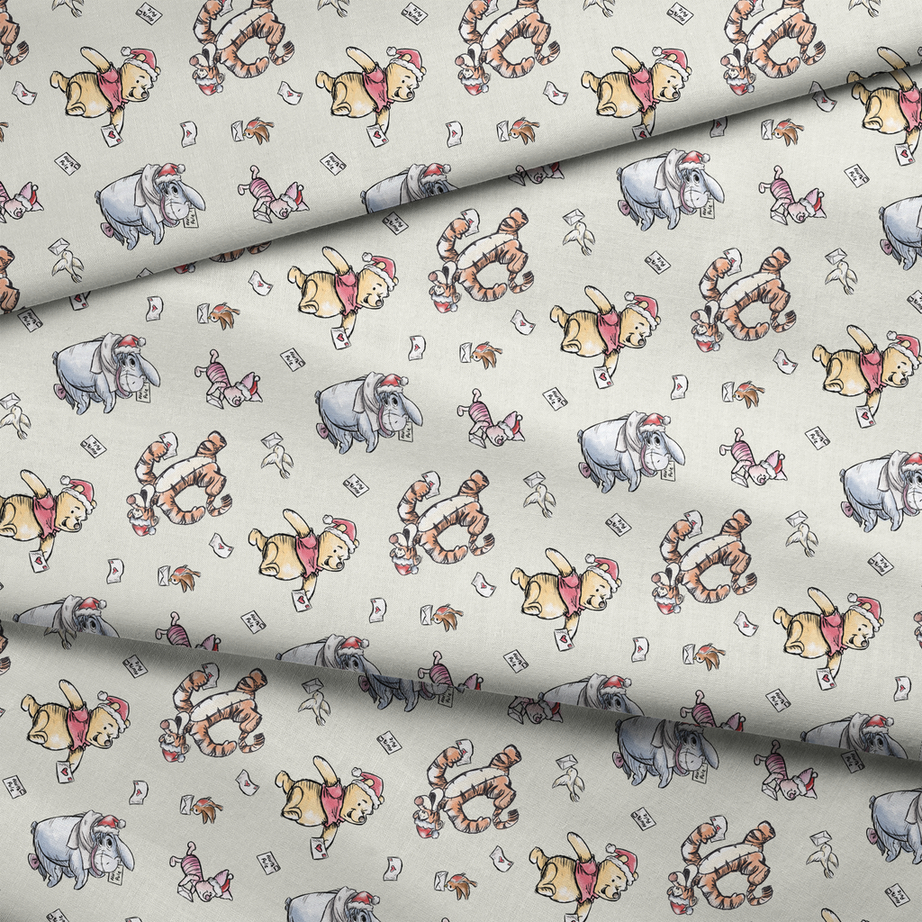 Whimsical watercolor illustrations of Disney's Winnie the Pooh and friends decorate this heartwarming fabric, featuring the beloved characters dressed in festive Santa hats with tiny envelopes containing loving messages scattered throughout. The classic characters are rendered in soft honey tones, muted grays, and touches of holiday red against a crisp white background, creating a nostalgic yet fresh design. Perfect for holiday quilting projects that will become a family keepsake