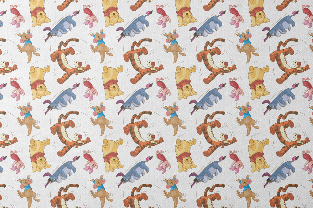 Adorable classic Winnie the Pooh characters in playful poses feature Pooh Bear, Piglet, Eeyore, and Tigger in a whimsical scattered pattern perfect for nursery decor or children's apparel.