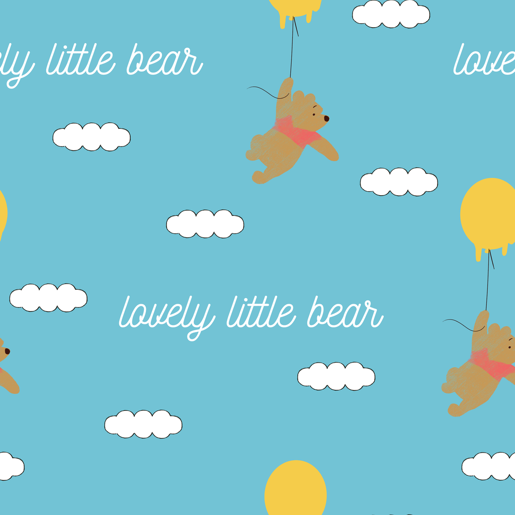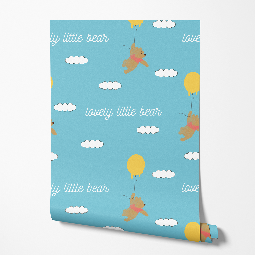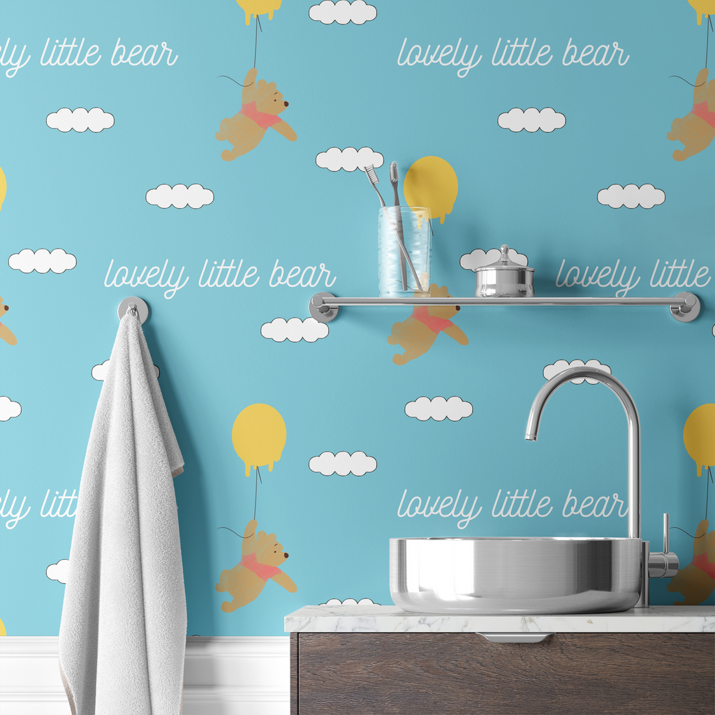 Sweet Disney Winnie the Pooh floats through a blue sky with fluffy white clouds, carried by bright yellow balloons with "lovely little bear" text. Perfect for nurseries.