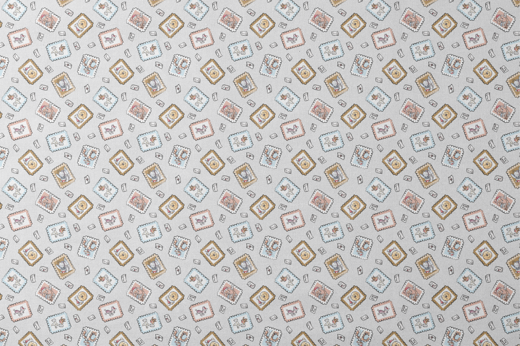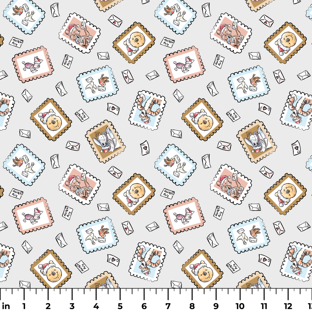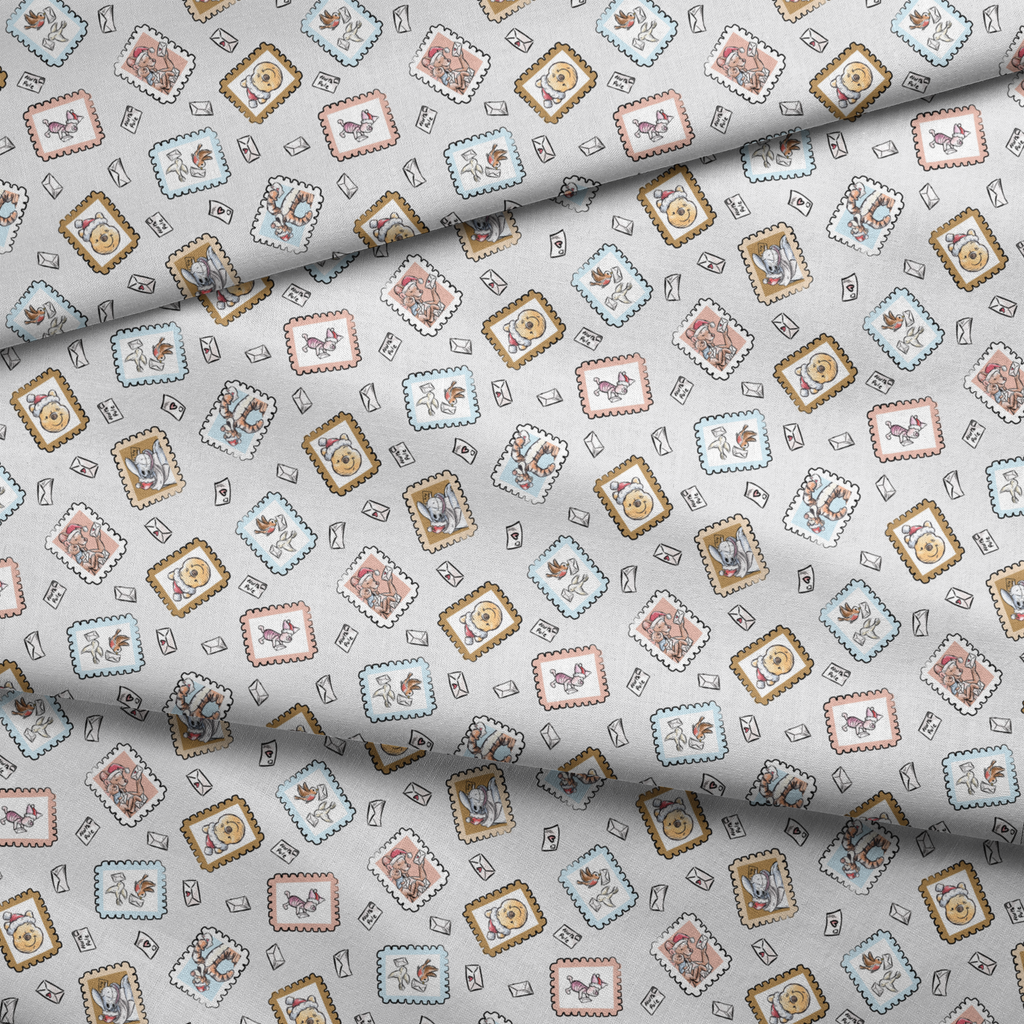 Delightful Disney's Winnie the Pooh and friends postage stamps dance across a soft white background, creating a whimsical postal-themed pattern. Classic characters like Pooh, Piglet, and Eeyore appear in colorful stamp frames of blue, pink, and gold, while tiny illustrated envelopes and "North Pole" postcards scatter between them. This charming fabric would make adorable holiday pillowcases or a special lining for a child's keepsake box.