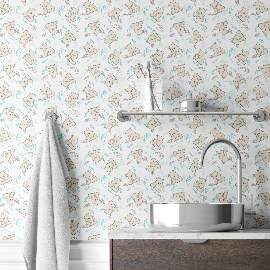 This adorable Disney Winnie the Pooh pattern features sweet Pooh in soft beige tones, floating on a background of swirling turquoise and gray brushstrokes. Perfect for nurseries and children's rooms.