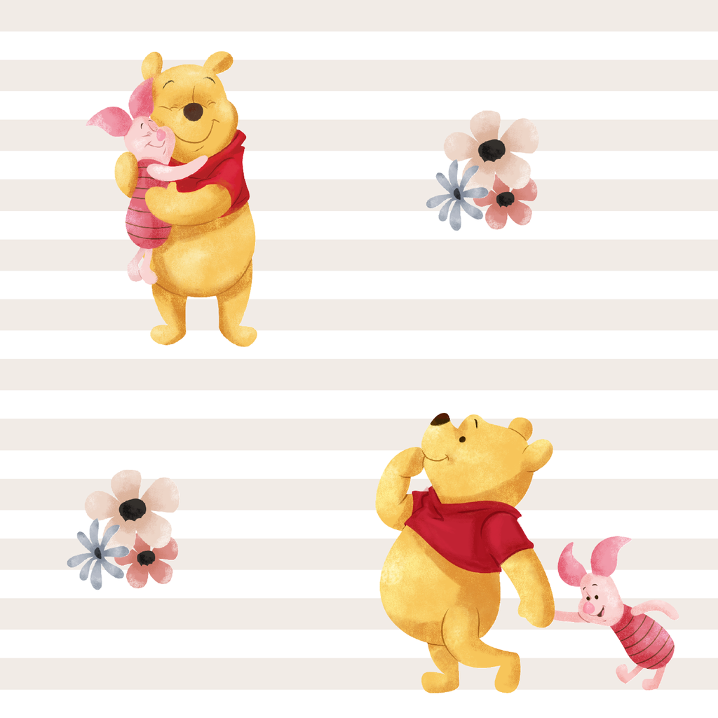 Classic Disney Winnie the Pooh and Piglet illustrations on a soft striped background with delicate floral accents, perfect for a nursery or children's room decor.