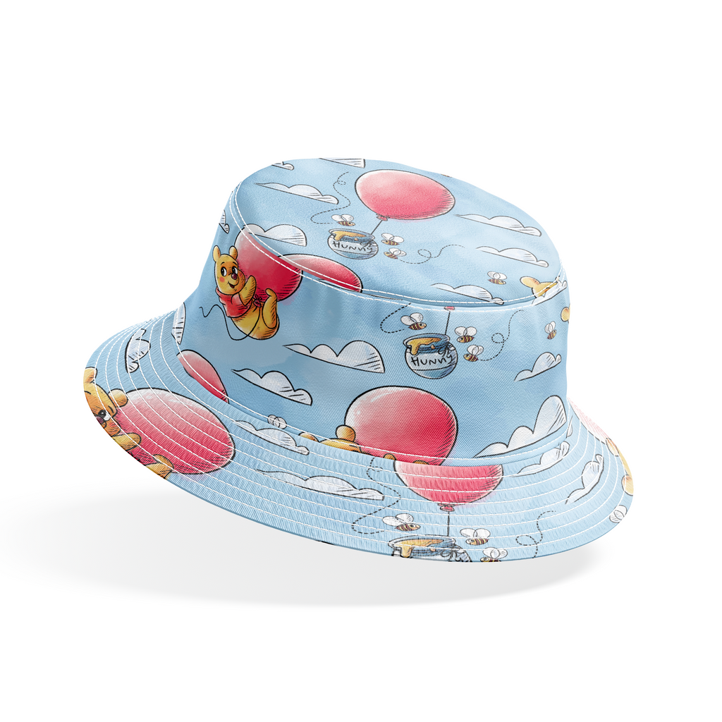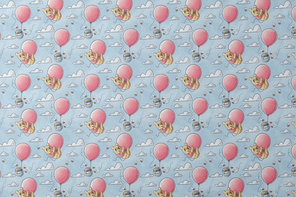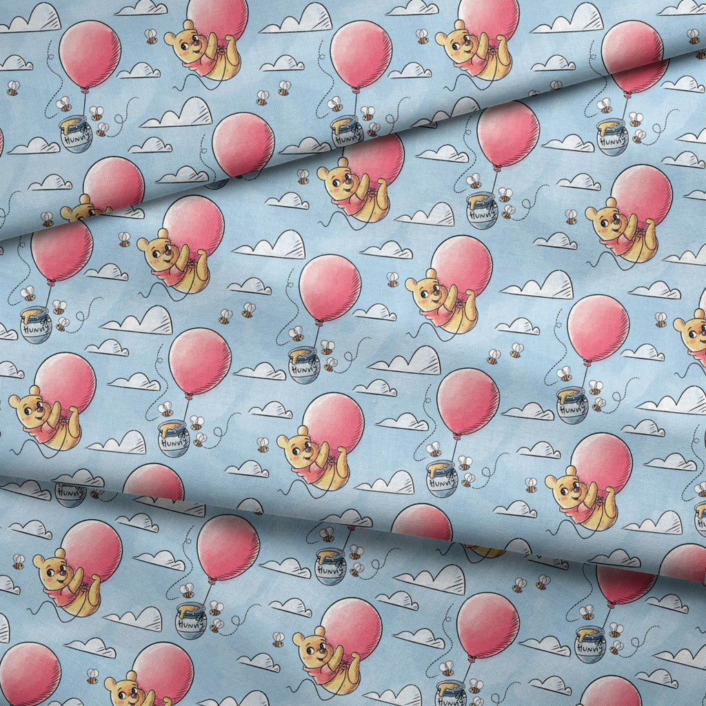 Whimsical Disney's Winnie the Pooh floats through a dreamy blue sky, holding onto cheerful pink balloons while honey pots dangle below on this enchanting fabric. Fluffy white clouds dot the background as buzzing bees create playful flight paths between the beloved bear and his precious hunny. Perfect for nursery quilts, pillowcases, or a special blanket that will bring childhood wonder to any little one's room.