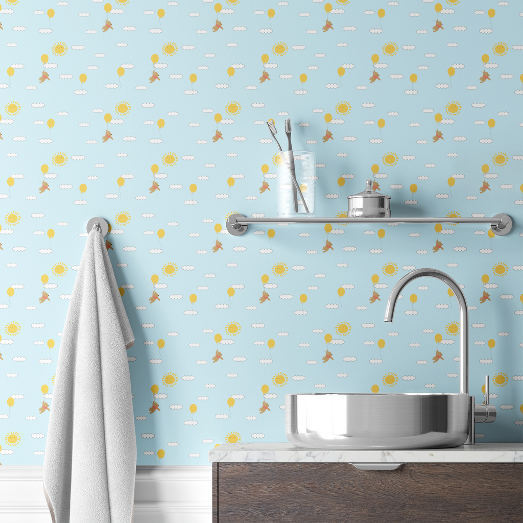 Adorable Disney Winnie the Pooh floats through a dreamy sky with bright yellow balloons against a light blue background with fluffy white clouds and smiling yellow suns. Perfect for nurseries.