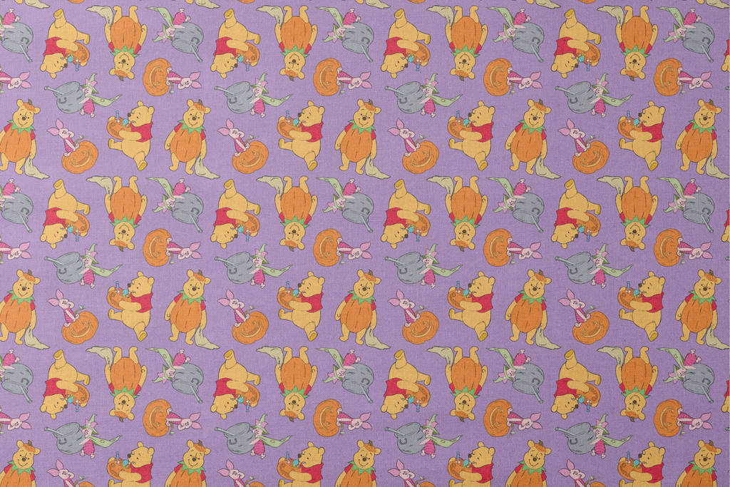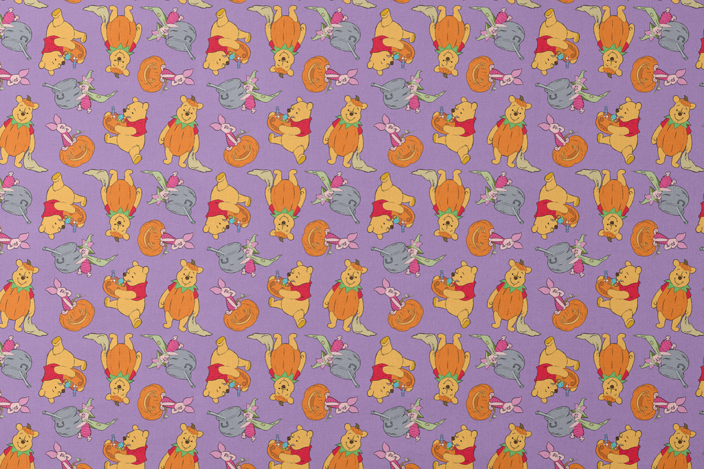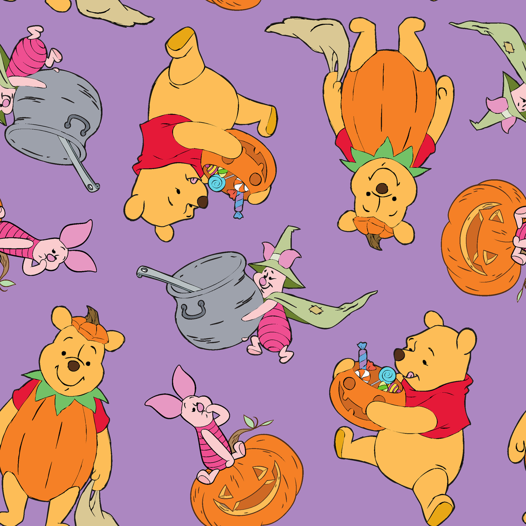 Delightful Halloween fun comes alive on this vibrant purple fabric featuring Disney's Winnie the Pooh and Piglet in festive costumes. The cheerful pattern showcases Winne the Pooh dressed as a pumpkin and holding a candy-filled jack-o'-lantern, while Piglet appears in an adorable witch outfit complete with a cauldron. Perfect for creating Halloween quilts, trick-or-treat bags, or a special autumn-themed nursery project.