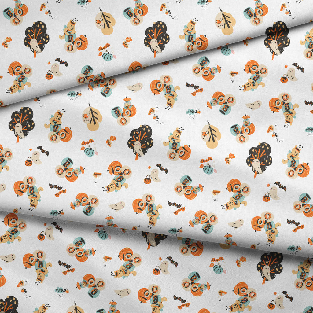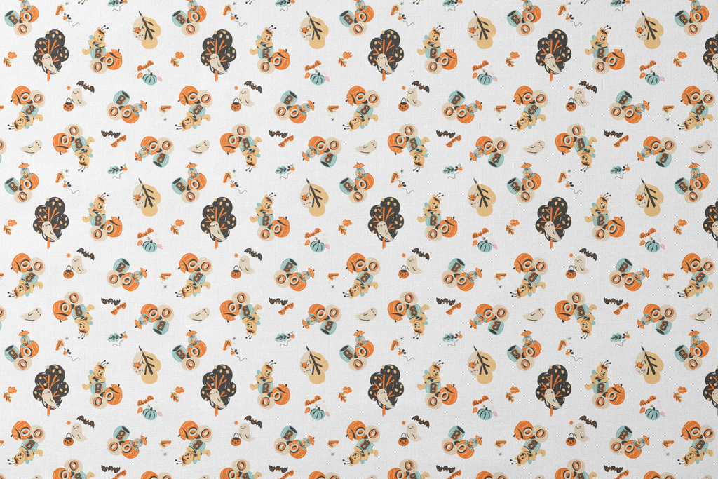 This whimsical Disney Winnie the Pooh Halloween pattern features Winnie the Pooh characters in a playful orange, teal and cream color palette - perfect for seasonal decor or festive apparel.