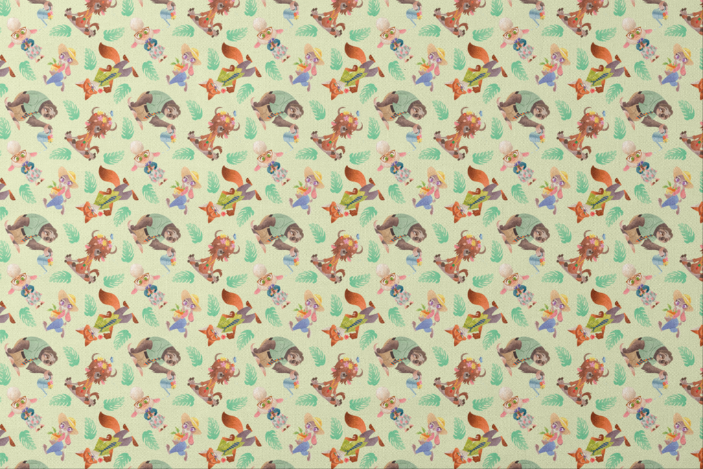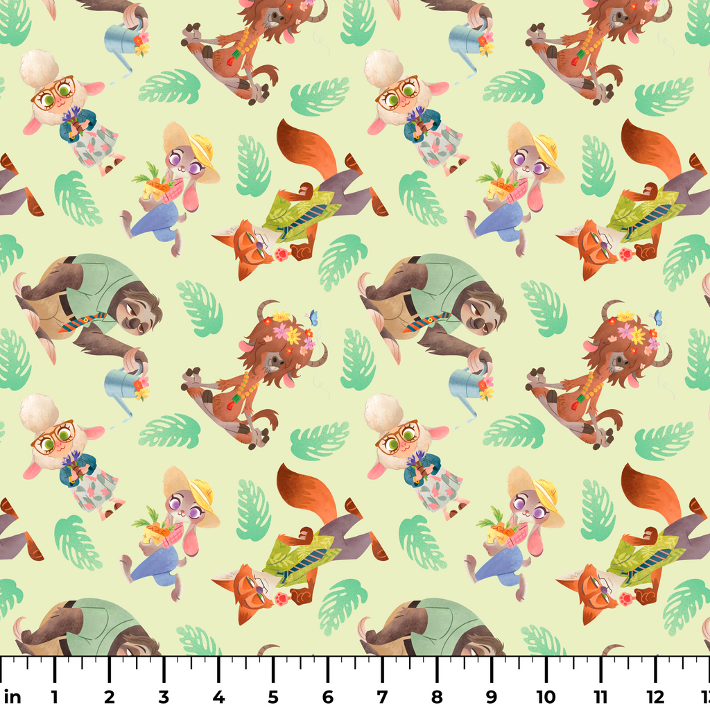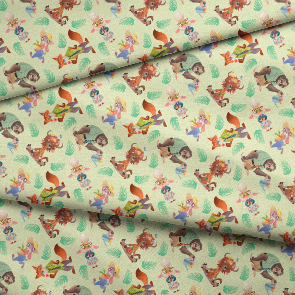 Adorable Disney Zootopia featuring favorite characters like Judy Hopps, Jack Wilde and more in stylized whimsical poses against a soft green background. Perfect for children's decor or apparel.