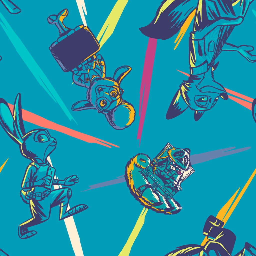 Vibrant Disney Zootopia character toss featuring Judy Hopps, Nick Wilde, Bellwether and more in fun, sneaky poses on a bright blue background with colorful diagonal stripes. Perfect for a playful Zootopia fan.