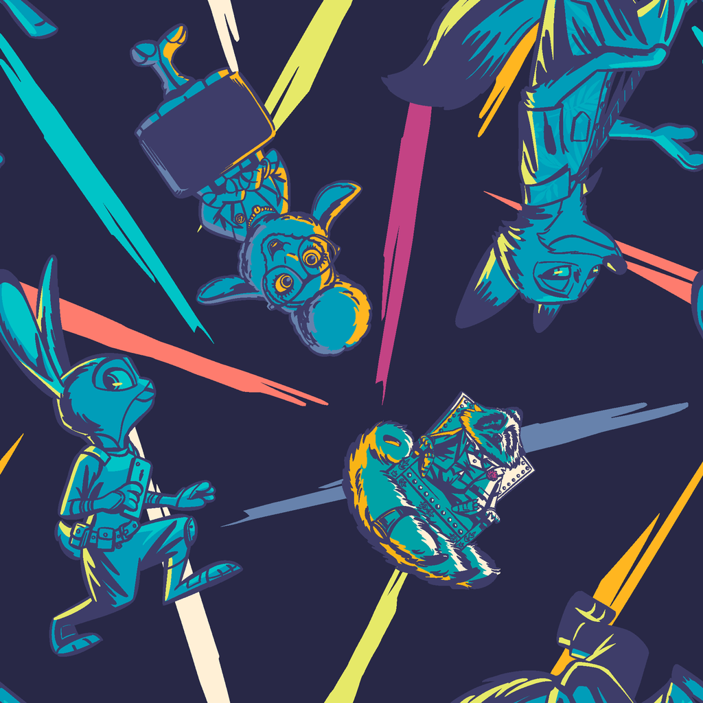 Vibrant Disney Zootopia character toss featuring Judy Hopps, Nick Wilde, Bellwether and more in fun, sneaky poses on a navy background with colorful diagonal stripes. Perfect for a playful Zootopia fan.