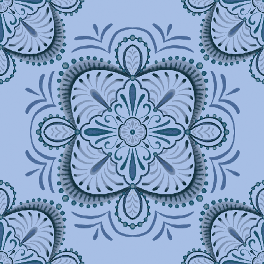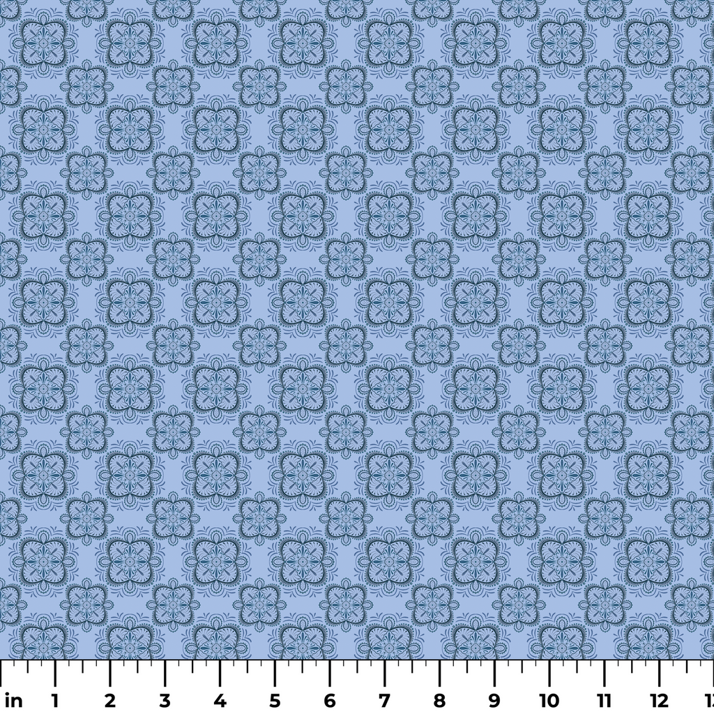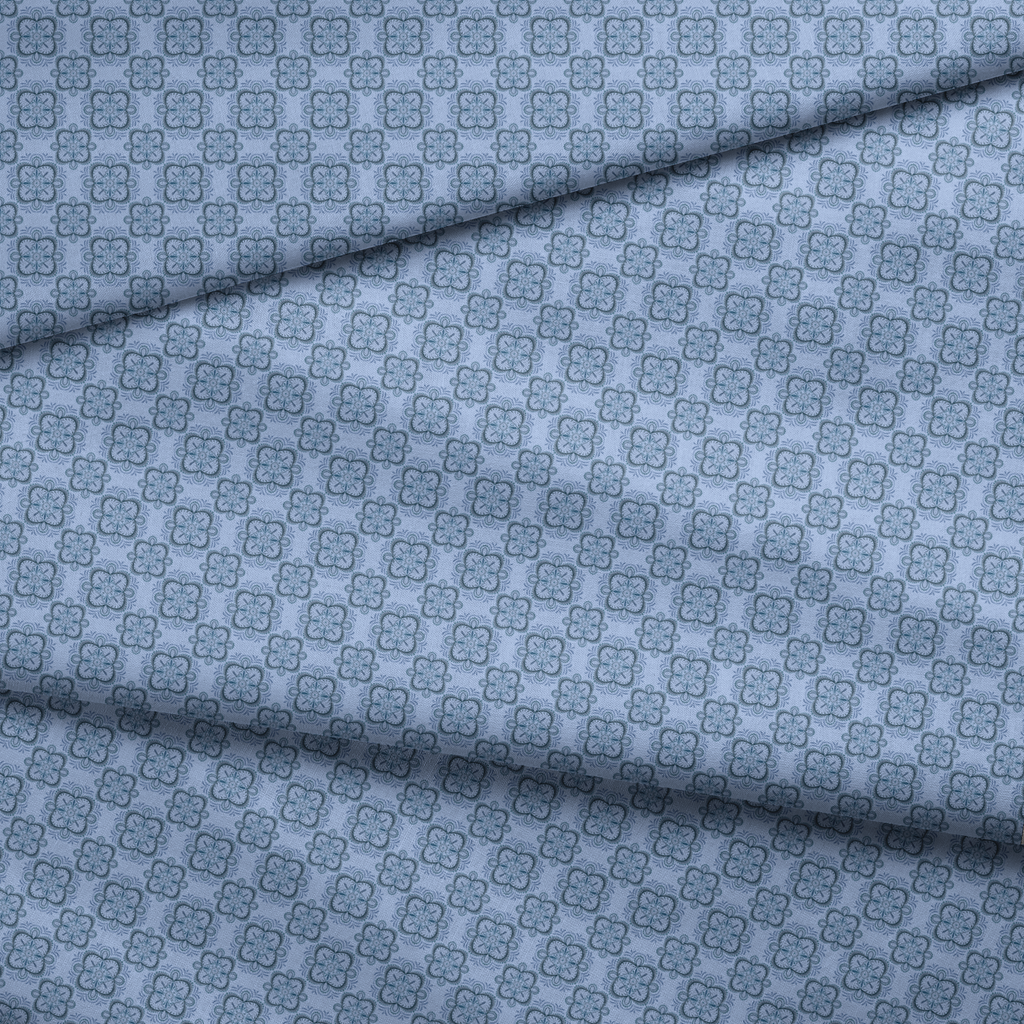 Intricate small-scale floral mandala design in layered blue tones creates a serene, symmetrical pattern perfect for quilting, decor, or elegant accessories.