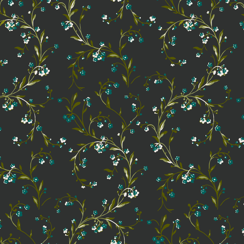 Elegant floral pattern featuring delicate blue and white blooms with graceful green stems against a rich black background, perfect for sophisticated home decor or fashion accessories.