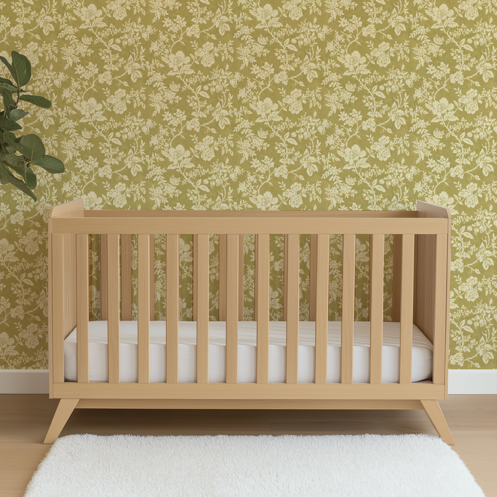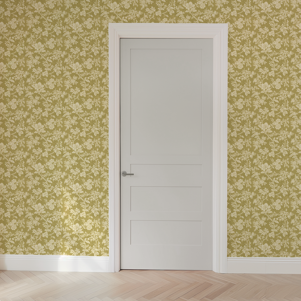 Cottagecore vintage-inspired floral block print wallpaper in soft cream on a muted olive background. Perfect for adding a touch of timeless botanical charm to any space.