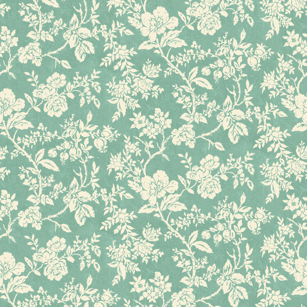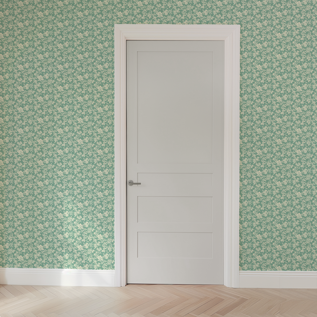 Cottagecore vintage-inspired floral block print wallpaper in soft cream on a muted minty teal blue green background. Perfect for adding a touch of timeless botanical charm to any space.