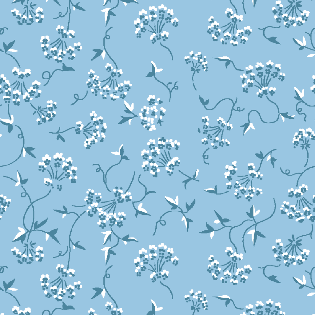 Delicate blue floral pattern featuring small white flowers and graceful vines on a soft powder blue background, perfect for a vintage-inspired aesthetic.