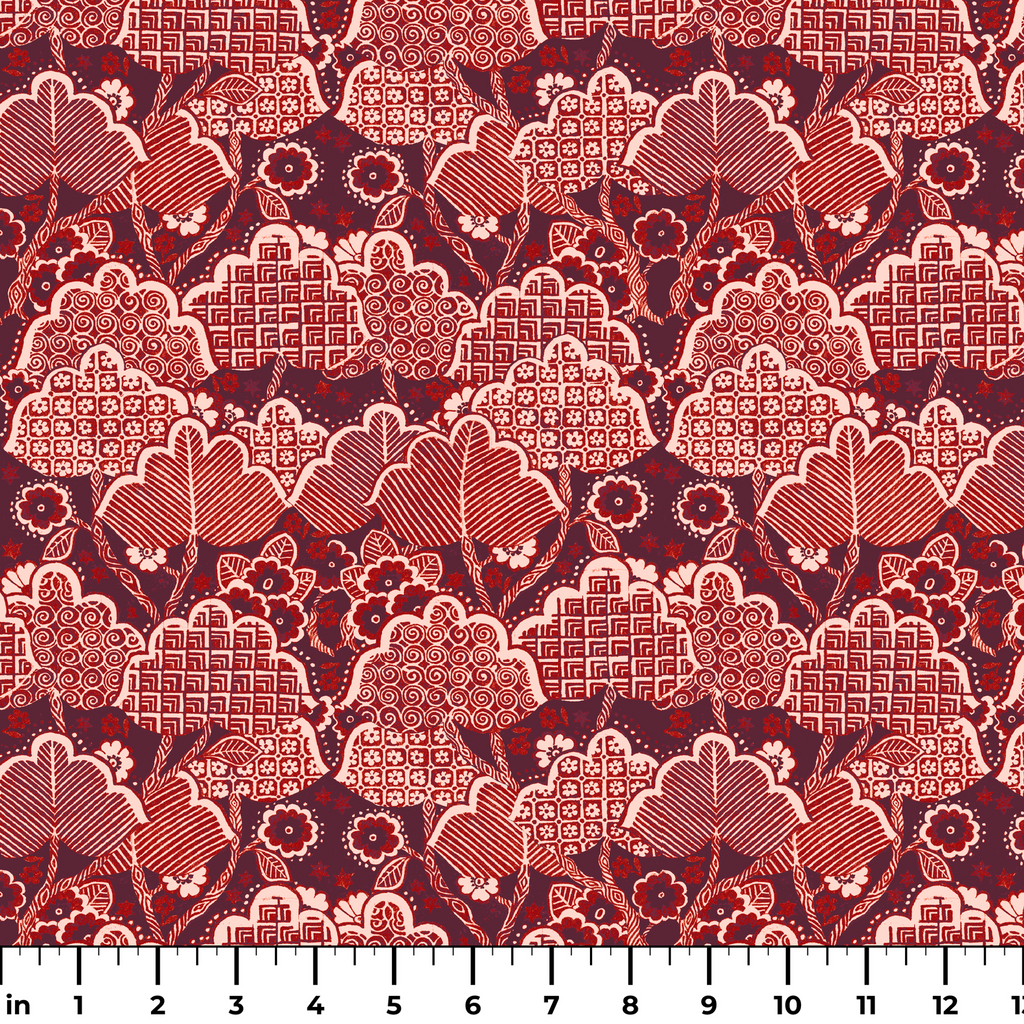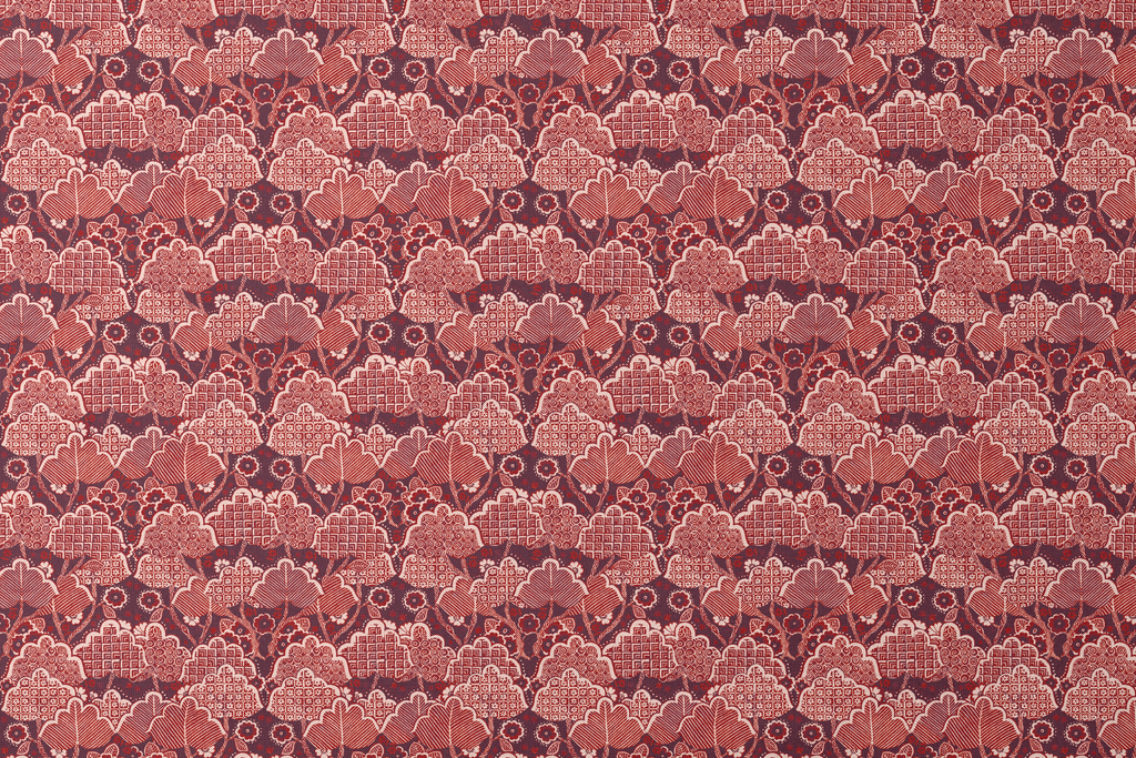 Vintage berry red and burgundy damask pattern with ornate floral motifs and geometric designs in traditional Victorian style for elegant home decor and quilting projects.