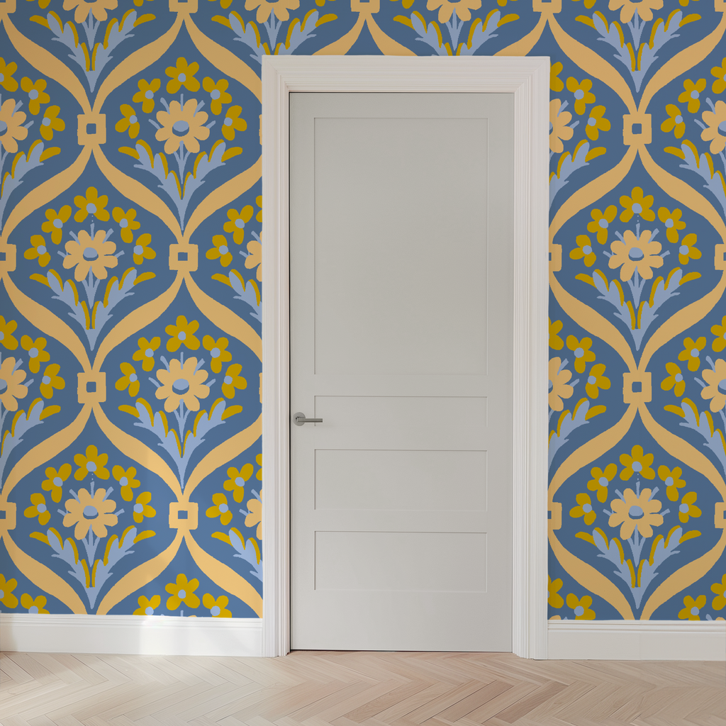 Vintage-inspired floral damask pattern featuring golden yellow blooms and botanical motifs on a blue background with ornate scrollwork and decorative elements.