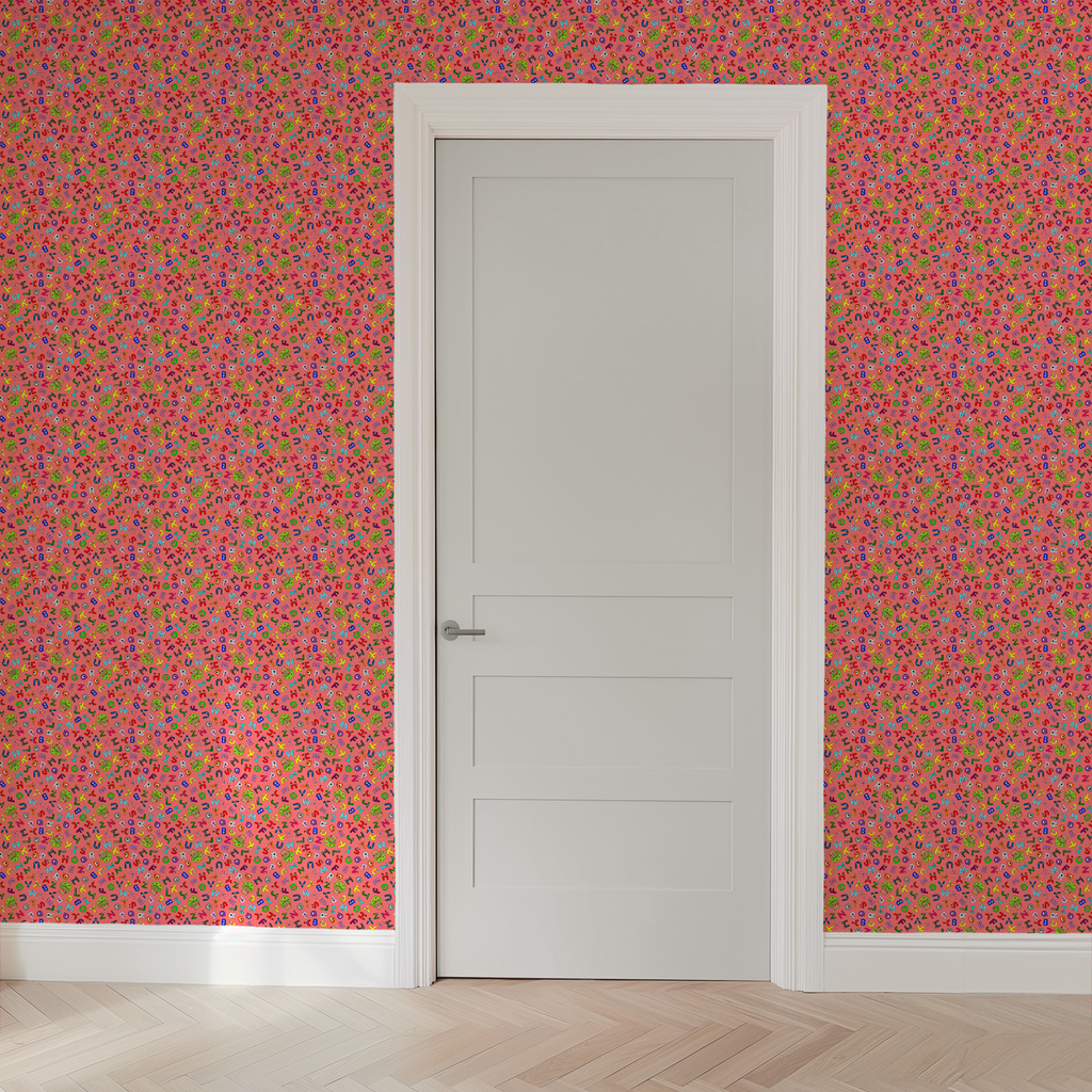 Colorful English Tree alphabet pattern featuring playful letters in pink, green, blue, and yellow on a coral-red background, perfect for children's rooms or nurseries.