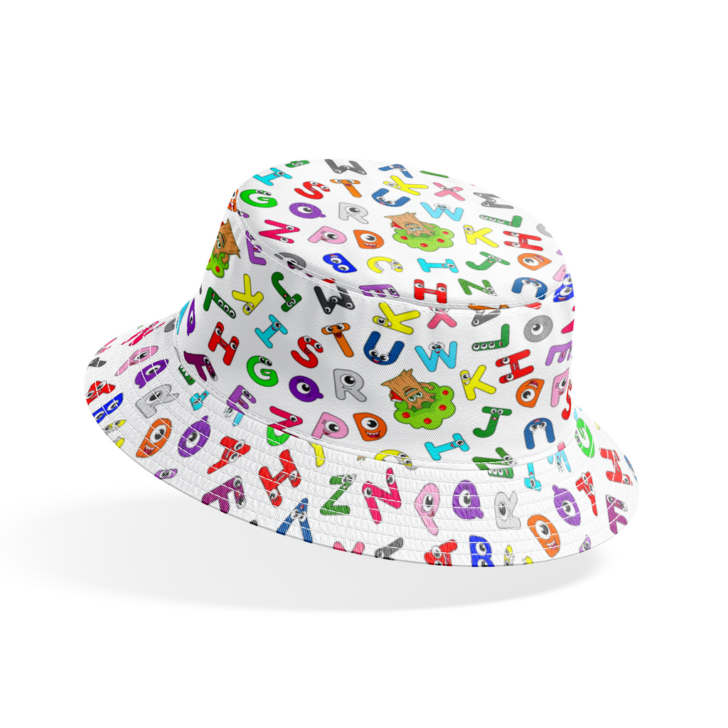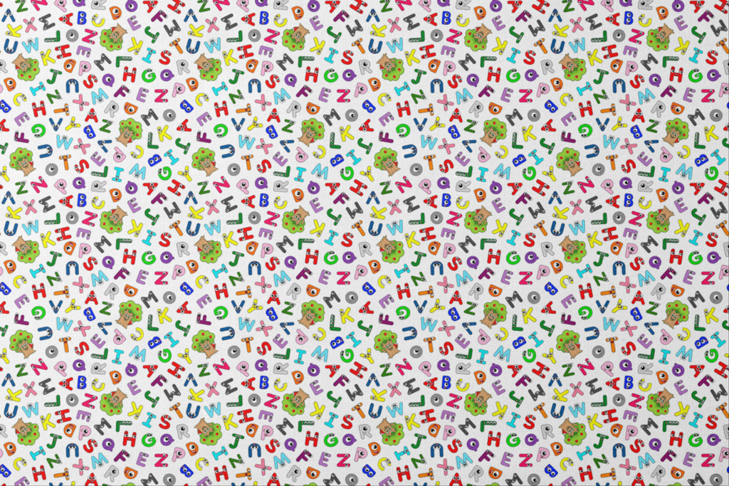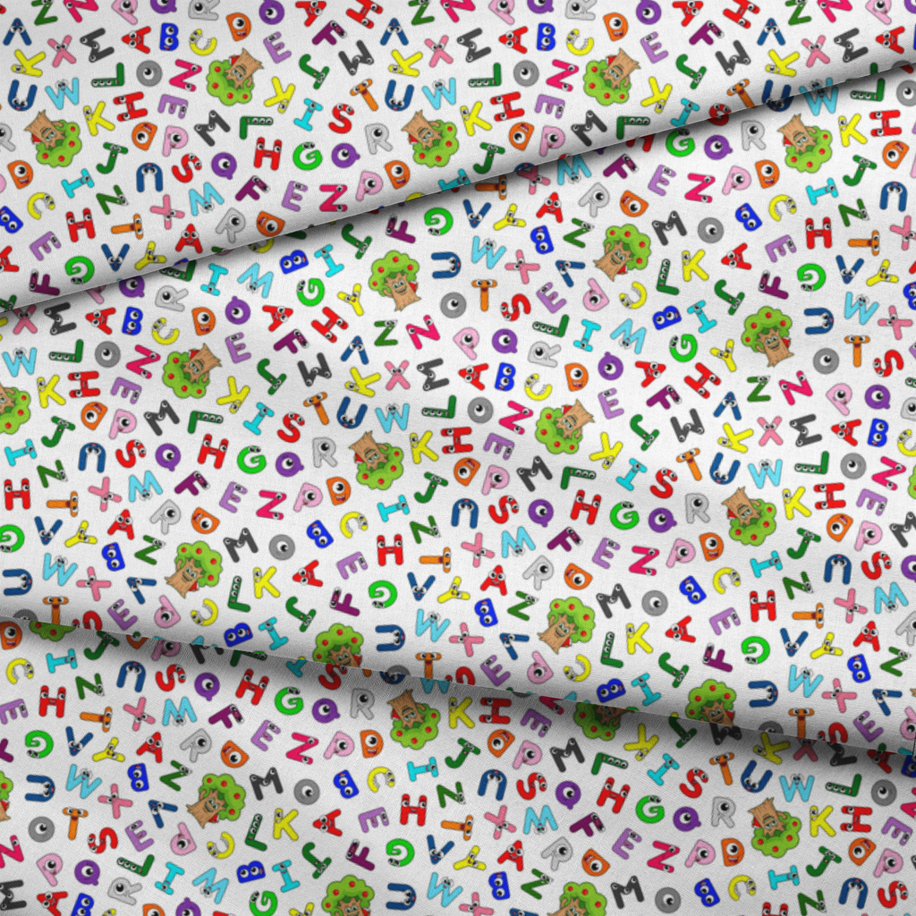 Colorful English Tree alphabet letters with playful character faces scatter across a white background in this whimsical educational pattern, perfect for children's room decor and educational crafting.