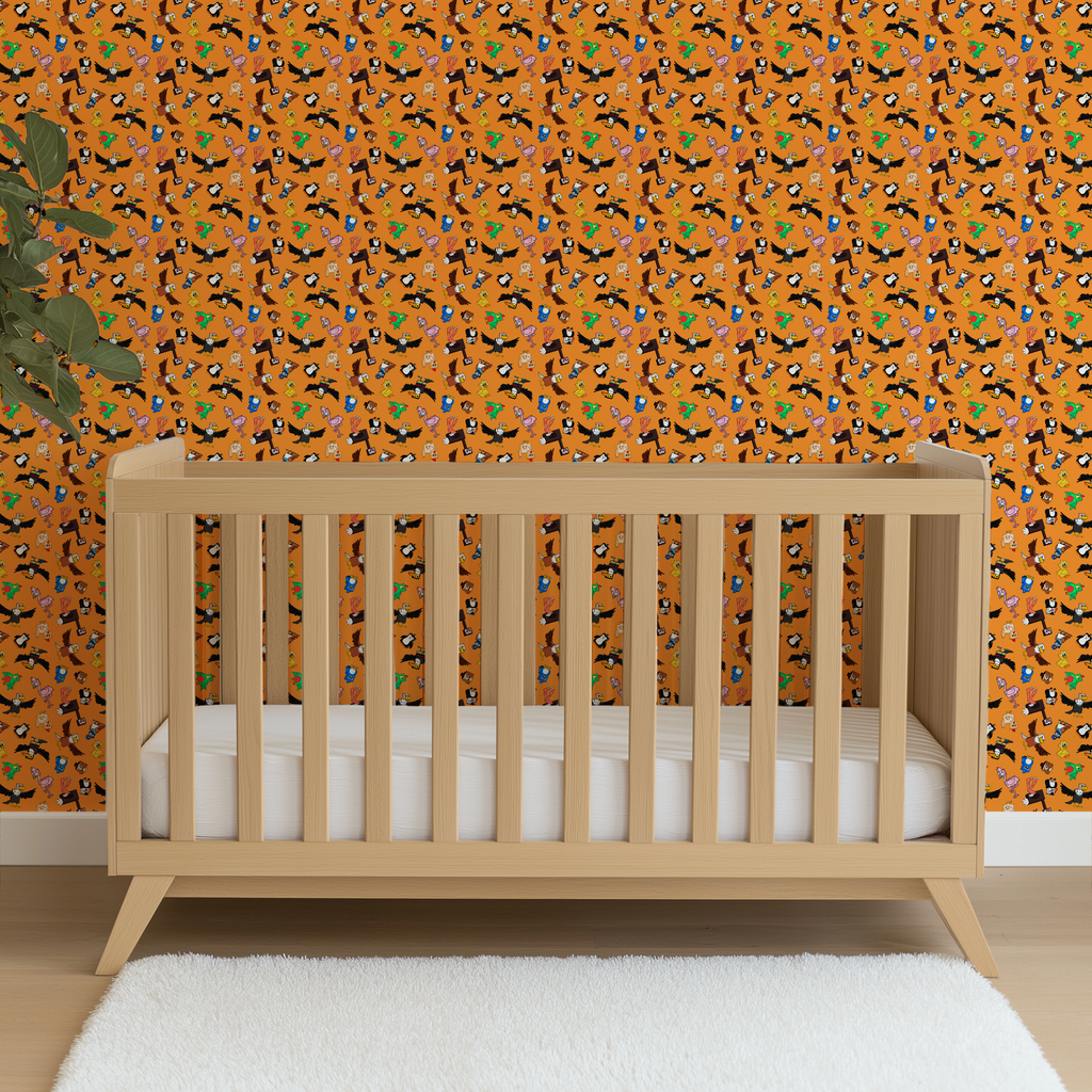 Vibrant English Tree cartoon bird characters on orange background featuring eagles, penguins, flamingos, and parrots in playful poses - perfect for children's rooms with its whimsical wildlife theme.
