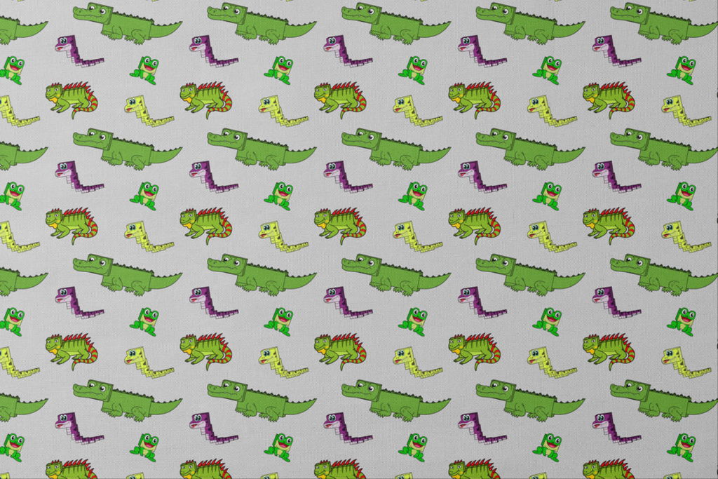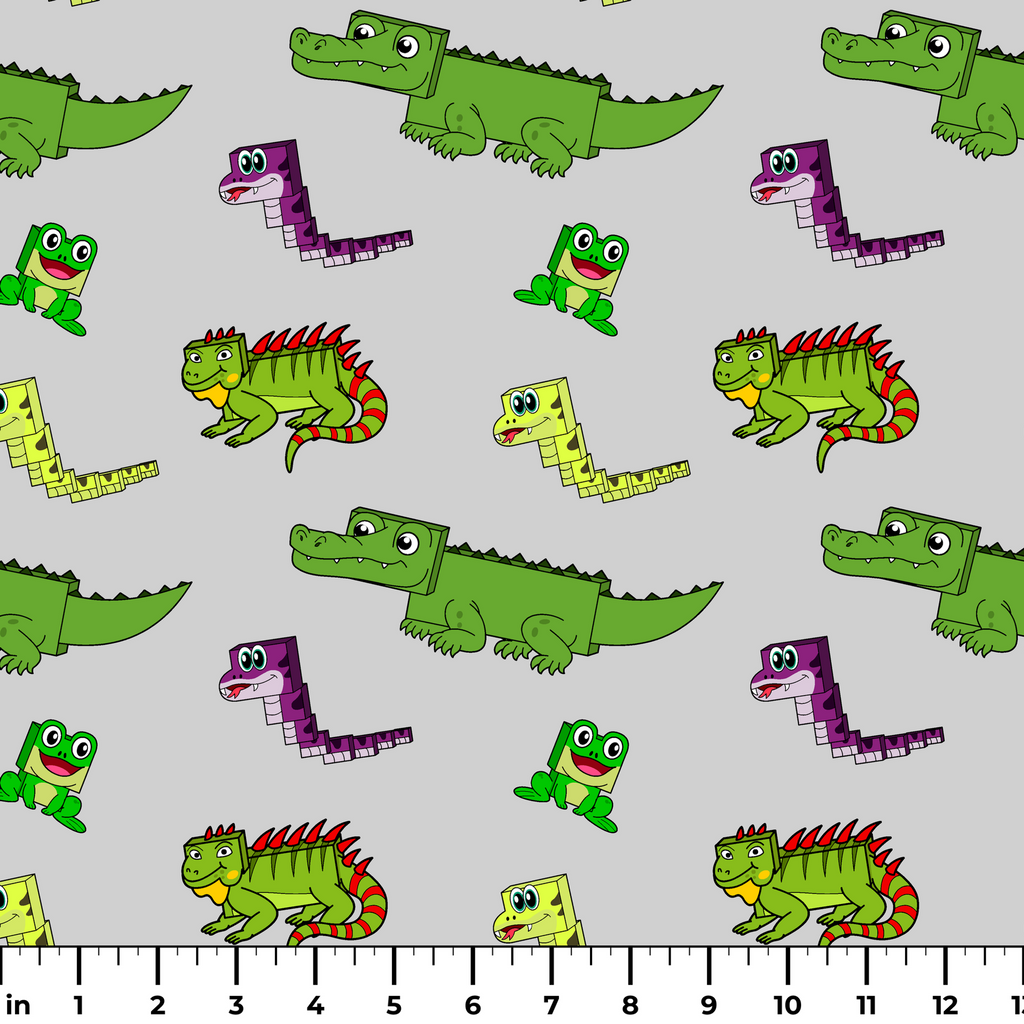 English Tree cartoon reptiles featuring alligators, snakes, and iguanas on a light gray background. Perfect for children's room decor or apparel.