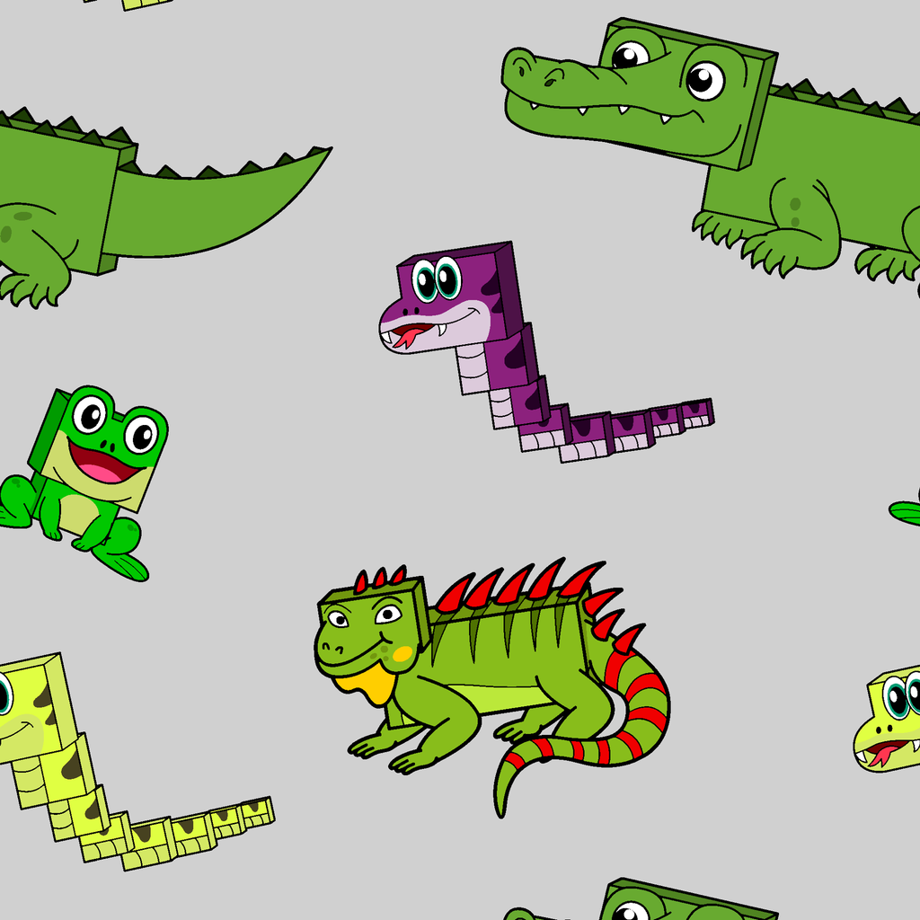 English Tree cartoon reptiles featuring alligators, snakes, and iguanas on a light gray background. Perfect for children's rooms.