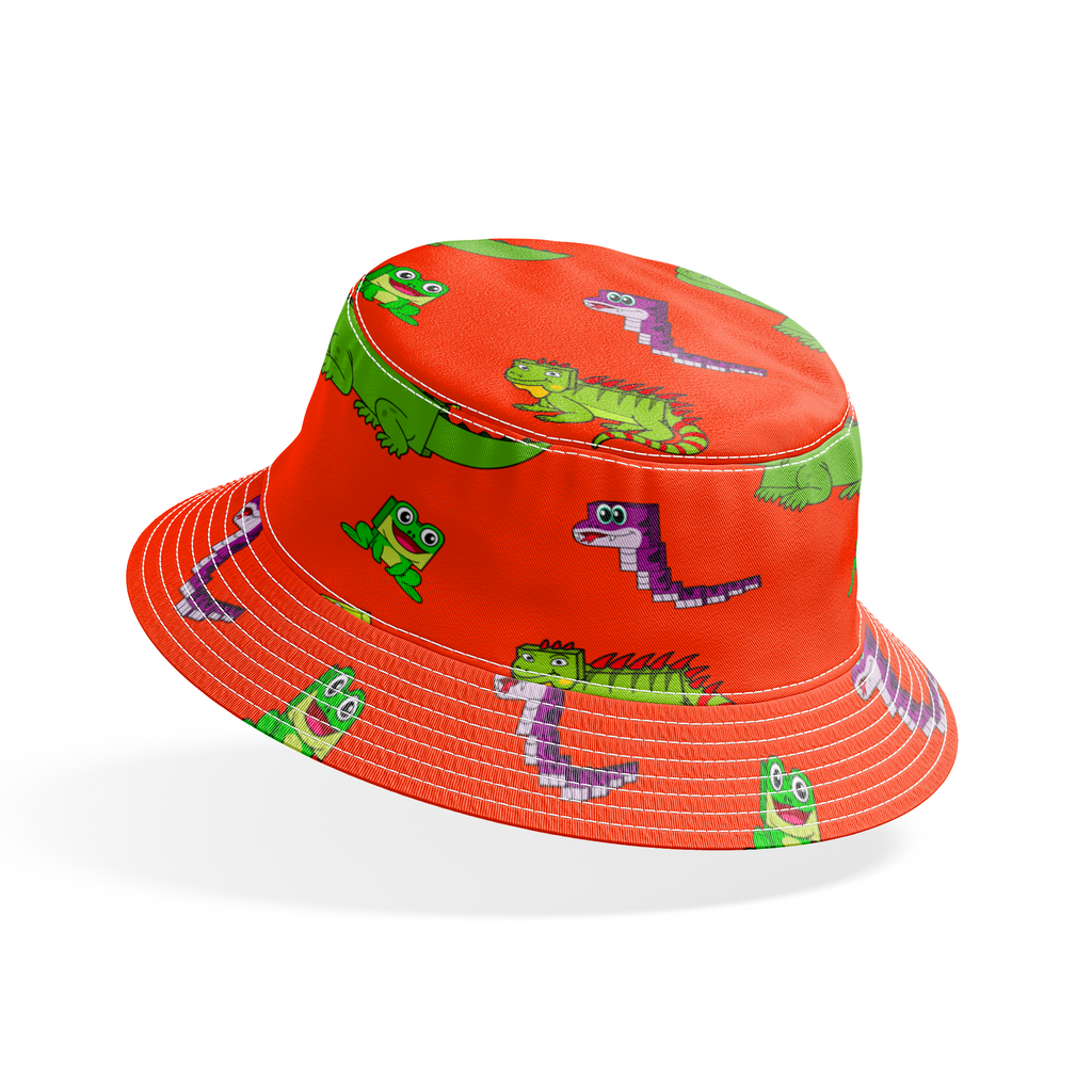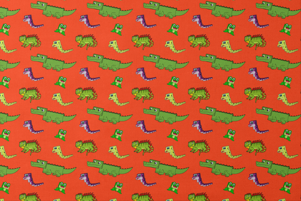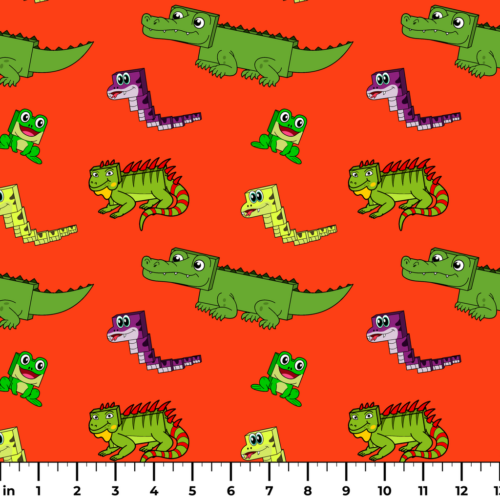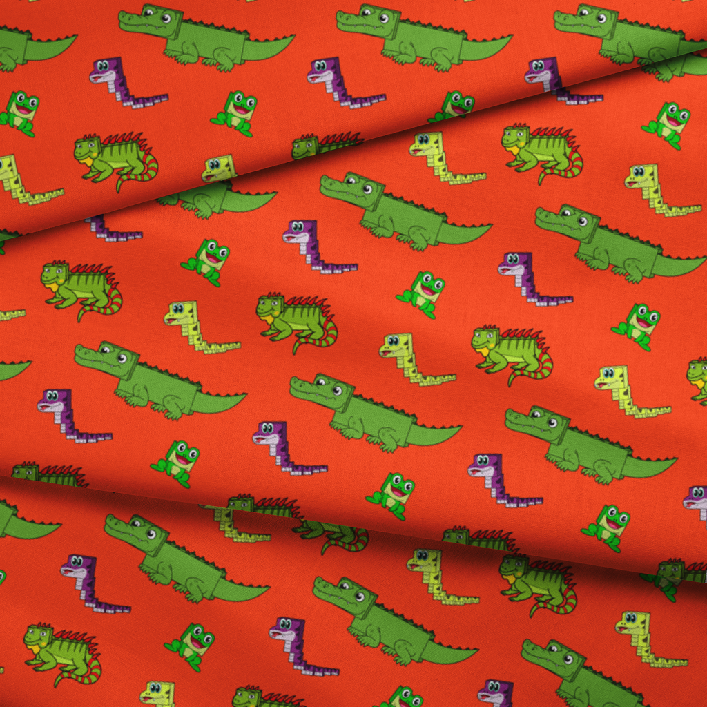 Bright, English Tree cartoon reptiles including alligators, lizards, and pixelated snakes on a vibrant red background. Perfect for children's apparel or playful home decor.